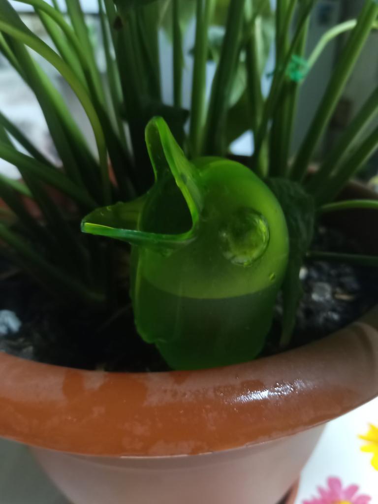 Заказ отправиоа 02.04.23 Получила 28.04.23 в почтовом терминале. До Эстонии посылка шла 27 дней. Это капельный полив для комнатных растений. Очень удобно использовать,когда уезжаешь в отпуск или на дачу или еще куда нибудь. Нужно резервуар наполнить водой, о5 вмещает 60 мл. Воткнуть в горшок с землей. Это будет происходить автоматически . Можно в воду добавоять удобрения водорастворимые. Он изготовлен в форме птицы с раскрытым клювом , в которвй заливается вода. Зеленого цвета, был еше в оранжевом цвете. Низ -керамический, он втыкается в землю. Высота 10,5 см Смотрится кпк птичка в цветке. Продавцу и службе домтавки 5+