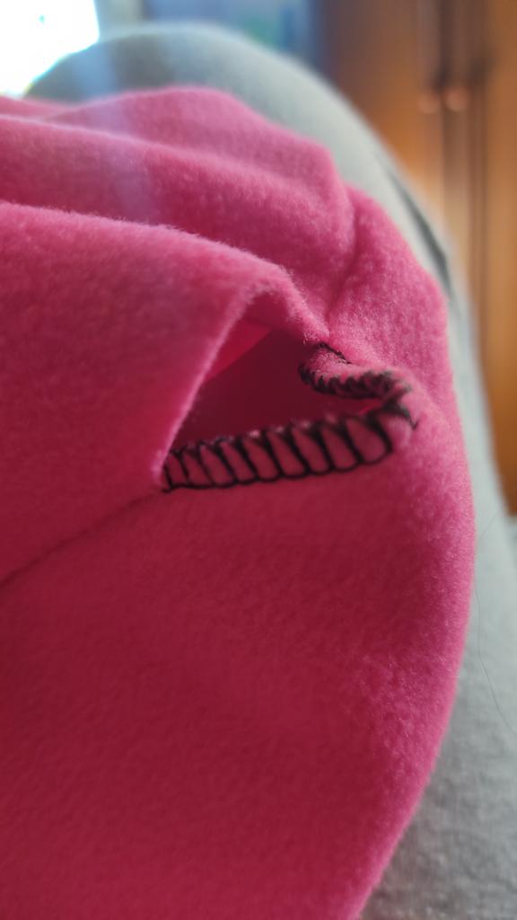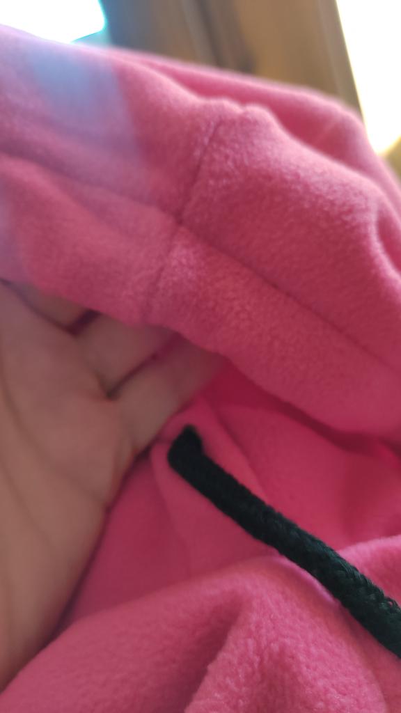 Задумка хорошая, ткань мягкая, цвет как я хотела. Минусы : пошито косо, на макушке дырка по шву, очень тесно пролазить голове, капюшон плотно облегает лицо.