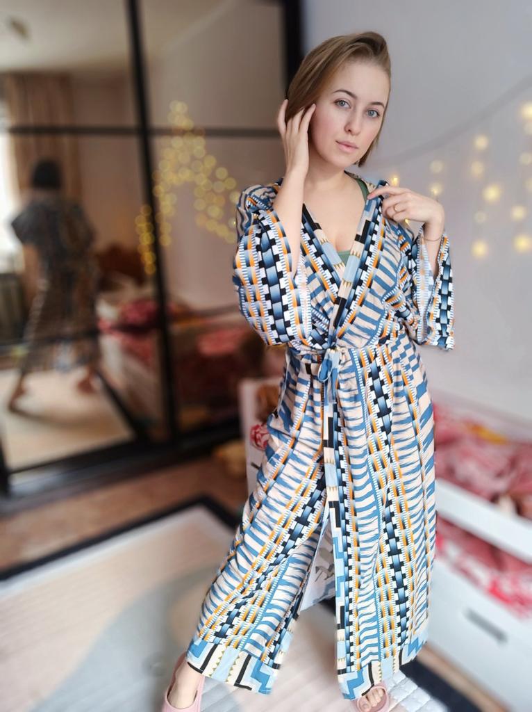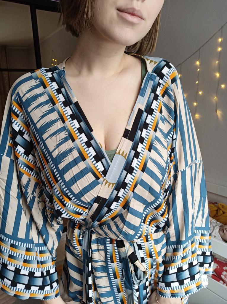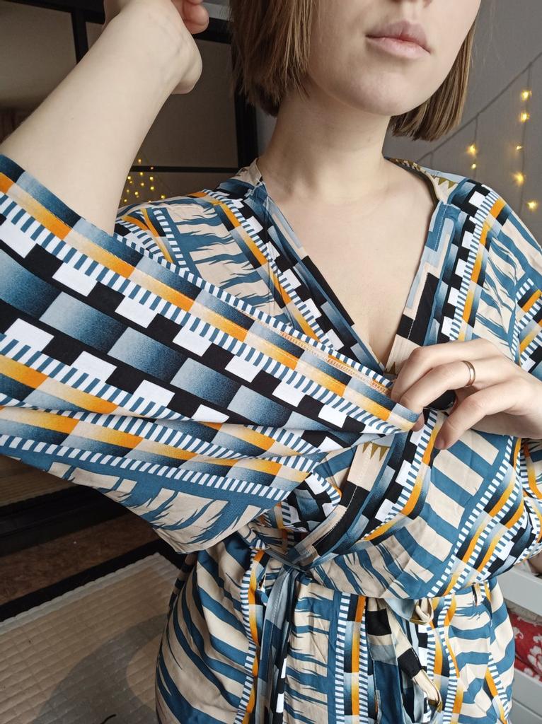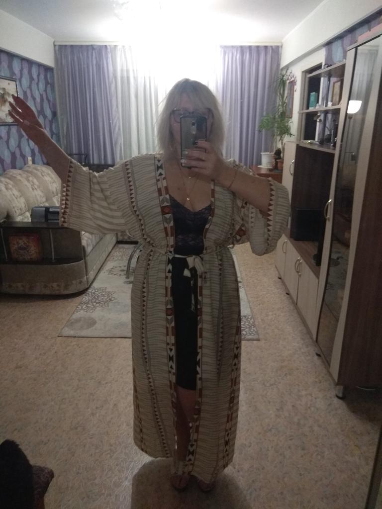 Кимоно мне очень понравилось, а размер единый, я знала, поэтому претензий нет, может еще и подсядет, ведь я не высокого роста, да и миниатюрная, всё равно на мне хорошо смотрится. Носить можно везде и с чем угодно. Либо как домашний халат, на пляж, в жарких странах и по улице, к примеру в Эмиратах, там так и надо ходить) Жду лета и путешествия куда-нибудь, однозначно на отдых я готовлюсь по полной, приобрела много разнообразных купальников, накидок для пляжа, рубашки, брючки хлопковые, ух! Красота, мне всё идёт и подходит! Я довольна! Спасибо Джум! Материал такой интересный, как будто холодит, струится, и хорошо гладится, да и мнётся наверное, я не садилась пока фоткалась) Карманов нет, это единственный минус, зато есть поясок. Можно пришить липучку или кнопочку, чтобы на груди не слишком раскрывалось, если носить как кимоно.