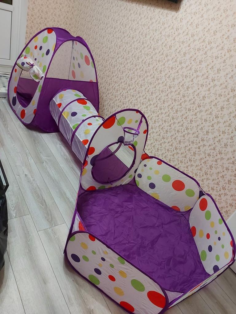 Детский игровой комплекс: палатка, туннель и бассейн 😍🎉 На выбор множество вариантов расцветок и форм. Комплекс пришёл в сложенном виде, в специальной сумке-чехле. Собирается элементарно, элементы скрепляются завязками, по желанию - что-то можно убрать или оставить, у нас комплекс занял реально половину детской комнаты 😃 Дети (6 лет и 2 года) его быстро приватизировали😄 закидали игрушками, в идеале - нужны ещё шарики для сухого бассейна. Потому что для них есть баскетбольное кольцо 🏀 В целом, игрушка детям очень понравилась, рекомендую, с удовольствием 👍 Есть быстрая доставка из России, даже к новому году успеет прийти 🎉