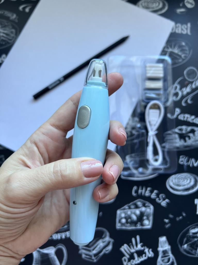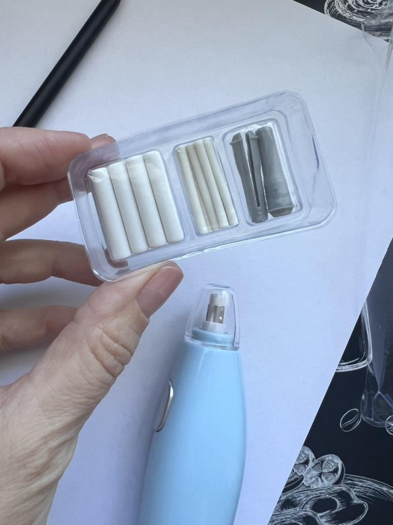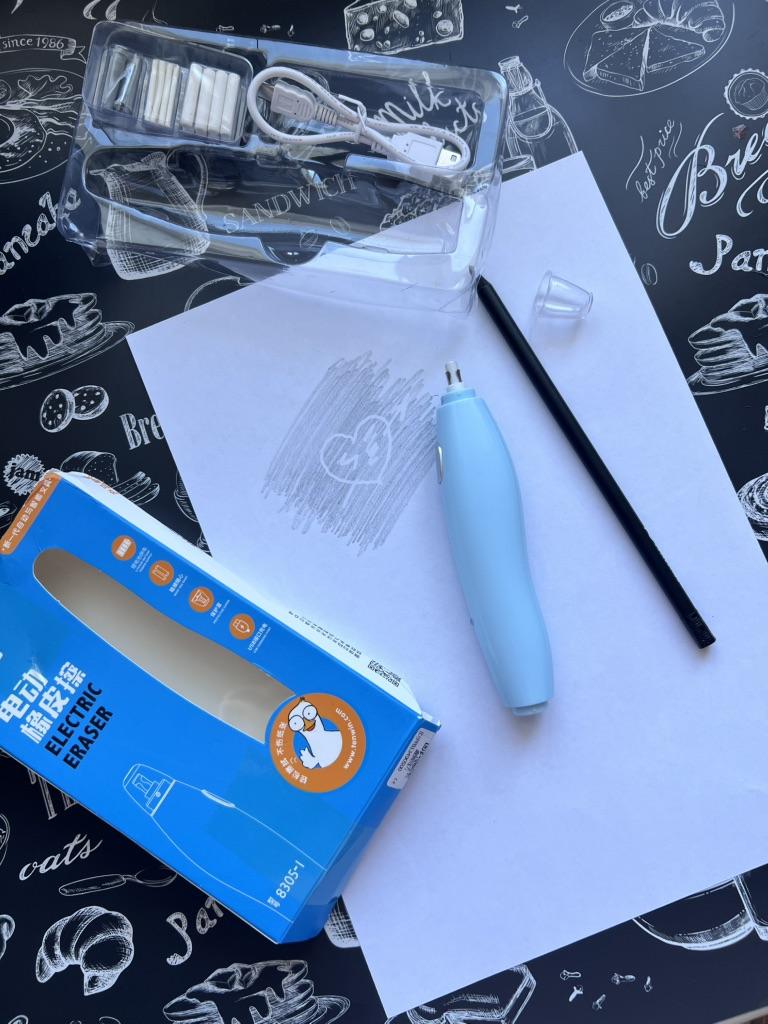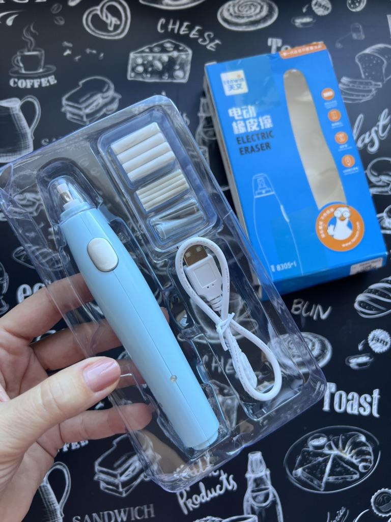 Электрический ластик.(см.видео ) Благодаря этому устройству можно точно, а самое главное быстро удалить все ненужные линии, при этом не разрушая саму бумагу. Электрический ластик очень удобно держать в руке потому как он выполнен в форме авторучки. В комплекте: С автоматическим ластиком идут 8 сменных ластиков- насадок больших и 8 небольших. а также два пластиковых наконечника для смены диаметра ластиков. А также USB кабель для зарядки. Маленькая автоматическая стирательная резинка с вращающимся приводом позволяет сделать точечное высветление рисунка и тонкую коррекцию работы. Мягкий ластик пригоден для всех типов поверхностей, деликатно и эффективно стирает, не царапает бумагу. Пришёл в фирменной картонной коробочке, хорошо упакован. Внучка ходит на кружок рисования, автоматический ластик протестировала, сказала всё отлично. К покупке рекомендую 💯