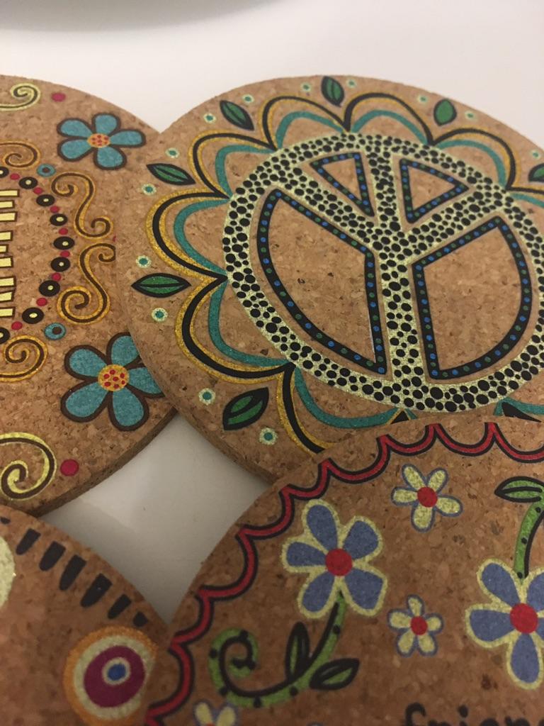 Классные пробковые подставки для кружек Идеально подходят под стандартный размер Рисунок выполнен качественно, в приятных оттенках в стиле хиппи Всего четыре штучки, пришли в мешочке В Молдову дошли за месяц