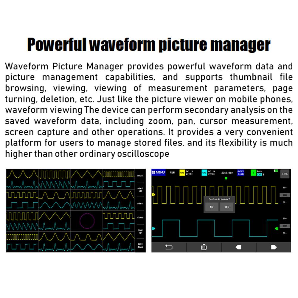 Мощный менеджер изображений осциллограмм поддерживает просмотр эскизов, просмотр, подробный просмотр, перелистывание страниц, удаление и увеличение формы сигнала, уменьшение, перемещение и т. Д..