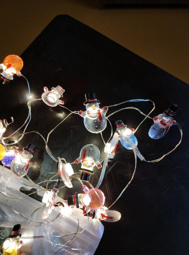 Доставка до Ростова-на-Дону около месяца. Упакованы в пакет. Работает от трёх батареек АА, в комплект не входят. Работает в двух режимах - мигает и просто горит. Снеговиков шустрые домашние дизайнеры успели покрасить, в оригинале они прозрачные с красными шарфиками и перчатками, а также в цилиндрах. Высота фигурок около 3 см