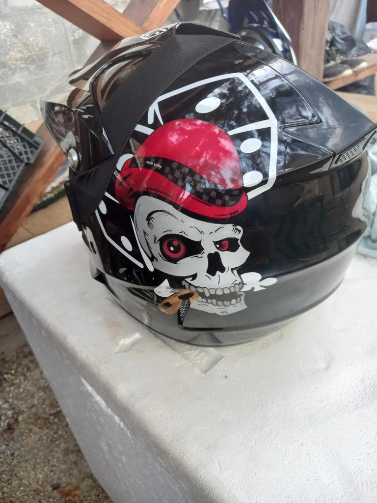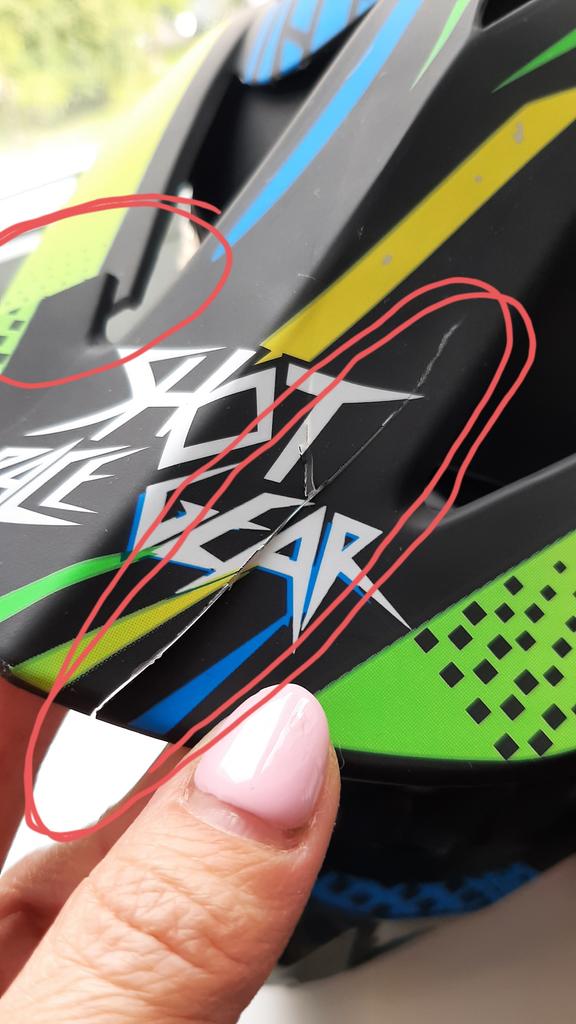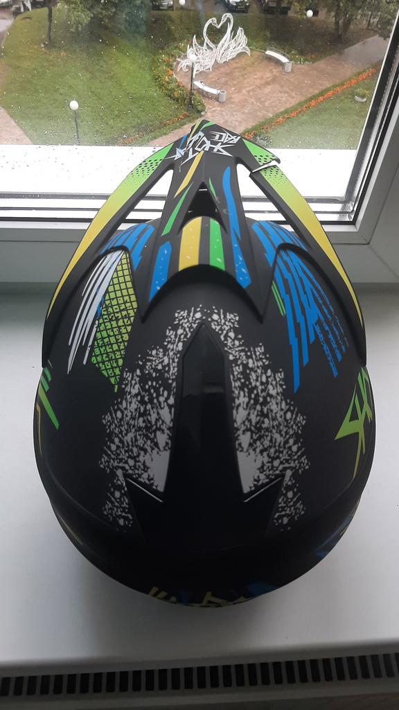Сам шлем красивый, яркий, удобный. Сыну очень понравился, всё подошло по размеру. В комплекте очки, перчатки, подшлемник. Но огромная печаль в том, что продавец не потрудился как следует упаковать его. Положил в обыкновенную коробку, которая в дороге была повреждена и соответственно повредились самые тонкие части на козырьке шлема. Написала претензию, вернули половину стоимости. Будем пробовать починить козырёк.