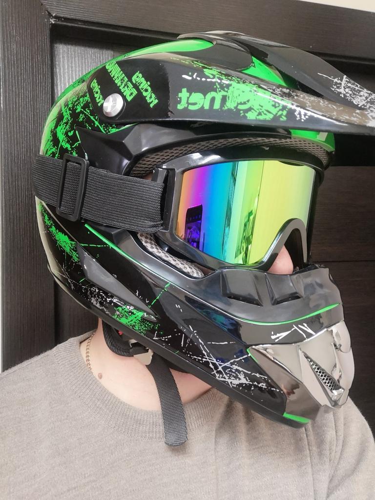 Больше всего переживала за соответствие размера, ибо есть небольшая разница с размерной сеткой специализированных магазинов мотоэкипировки. Но! Всё идеально, размер точный, самое то, что нужно, лучше и быть не может. Хорошее качество печати, не нашла никаких сколов, отклеек картинки или чего-либо подобного. Для сравнения, шлем подобного размера в магазине (в зависимости от бренда, конечно) стоит от 4-х тысяч. Естественно, в эту стоимость не входят ни очки, ни маска, ни перчатки. 💢Качество очков, кстати, даже превысило ожидания. Заказывали раньше на джуме, но у другого продавца подобные, с зеркальным затемнением - в них в сумерки уже ничего не видно, приходится снимать. Очки, которые пришли со шлемом в подарок, намного лучше по качеству плёнки - вид через них с минимальным эффектом затемнения, всё прекрасно видно. Перчатки маленького размера, подошли на мою маленькую женскую руку, но свободно. Для мужчин с большой ладошкой будут маловаты. Маска из очень приятной к телу ткани, хорошая липучка, анатомически тоже неплохо скроена, отличная защита шеи и горла от ветра. Резюмирую: заказом и продавцом довольна на все 300 процентов. Доставка отслеживалась полностью по всему пути, по времени составила 1,5 месяца, дольше всего заказ пробыл в Монголии. Спасибо продавцу и платформе Joom💕