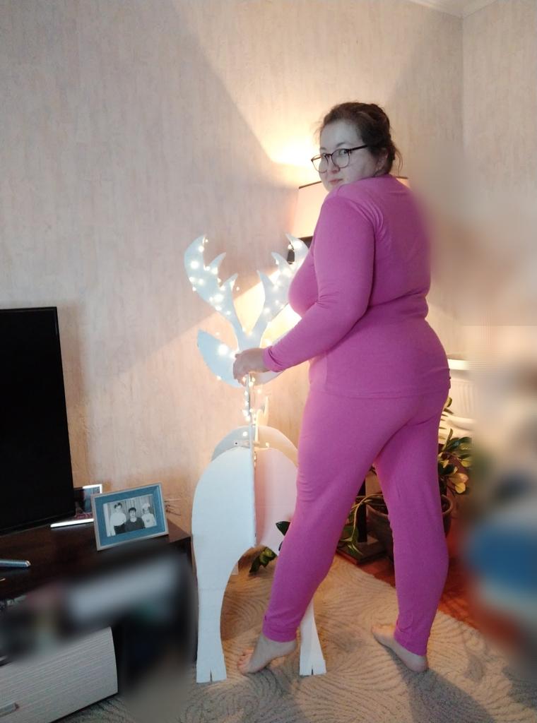 Комплект термобелья в ягодном цвете. Для себя заказала размер 5XL. Он хорошо сел на мои параметры 120/100/110. Рукава и длина штанин немного велики для моего роста 157 см. Очень удивил тот факт, что плотность ткани и размер отличается от серого костюма который я заказала того же цвета в этом же магазине. Как так 🤷 ну кто его знает... Хорошо выполненные строчки. Резинка в брюках комфортно сидит на животике, не перетягивает. За счёт того, что размер оказался больше чем аналогичный серый костюм, это термобелье заметнее под одеждой за счёт образуемых складок. Всё же покупая термобелье я рассчитывала на большее облегание тела. Материал плотный, но тоньше серого костюма, трикотаж качественный, внутри немного плюшевый. ⭐ Продавец упаковал товар в матовый пакет с зип-замком и почтовый конверт. ⭐ Трек номер отслеживался до почтового отделения. ⭐ В приложении пришло уведомление о готовности к выдаче заказа. ⭐ Доставка в Петербург заняла 27 дней. Подписывайтесь на меня в ВК переходя по QR коду или ссылке в описании профиля, там много интересного, живое общение, промокоды на скидку, а так же видео инструкция, как я делала этого оленя своими руками.