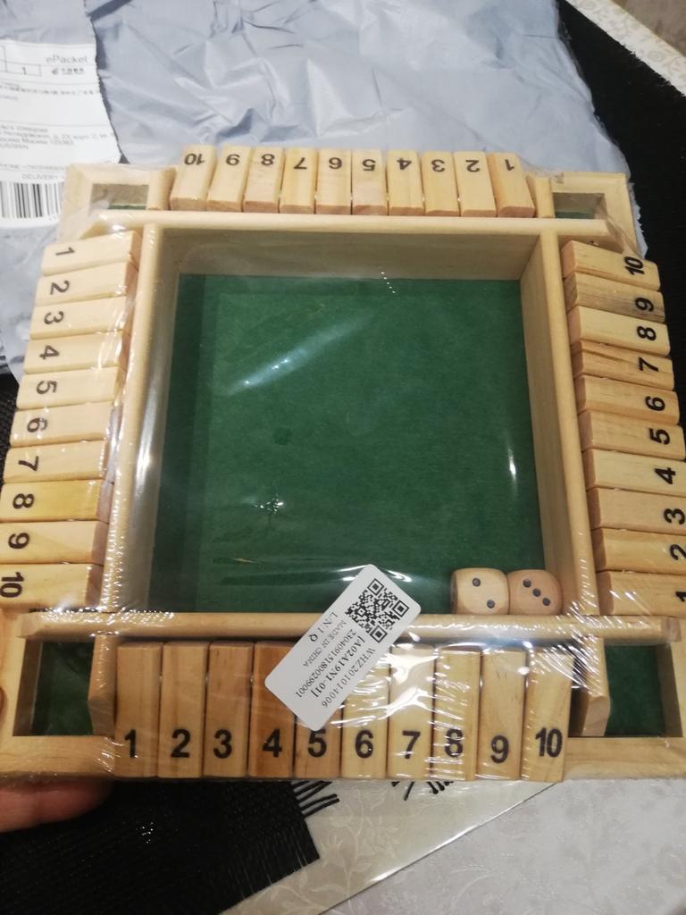 Отличная игра из дерева. Качество хорошее. Поле из плотного фетра. Каждая сторона брусочков с цифрами закреплена на железной перекладине, что позволяет им переворачиваться,, оставаясь на своем месте, не теряясь. Кости тоже деревянные. Коробки нет, но она в данном случае и не нужна.