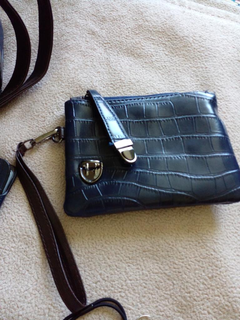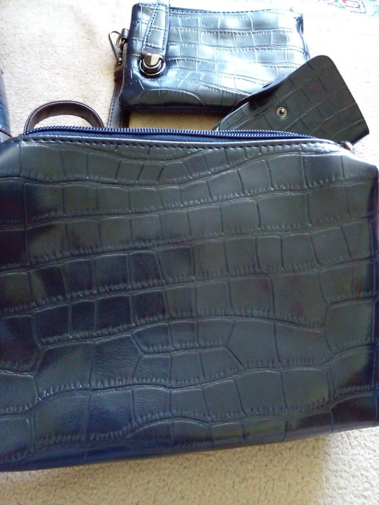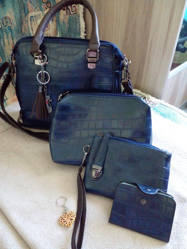 Получила набор из 4 предметов. В принципе довольно прилично, но мне не понравились ручки у сумки. Во - первых, они другого цвета, что немного портит внешний вид, во- вторых обработка этих ручек ужасная- какие то корявые на вид. У барсетки торчат нитки в швах. Визитница на 6 визиток. Внутри сумки 3 отделения, одно из которых на молнии. Два кармашка, один на молнии. С боковой внешней стороны сумки отделение на всю её ширину и с обеих сторон молния. И один кармашек с внешней стороны на молнии. Вторая сумочка типа клатча, к которой так же на карабин крепится ремешок- больше похожа на косметичку. Всё бы ничего, но немного грубовато, поэтому 4 звезды за качество. Положили два подарка за заказ - две резинки для волос и брелок деревянный в виде сердечка.