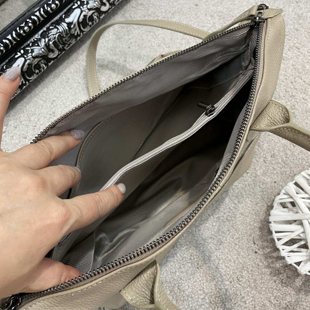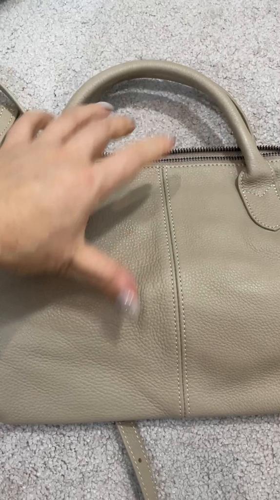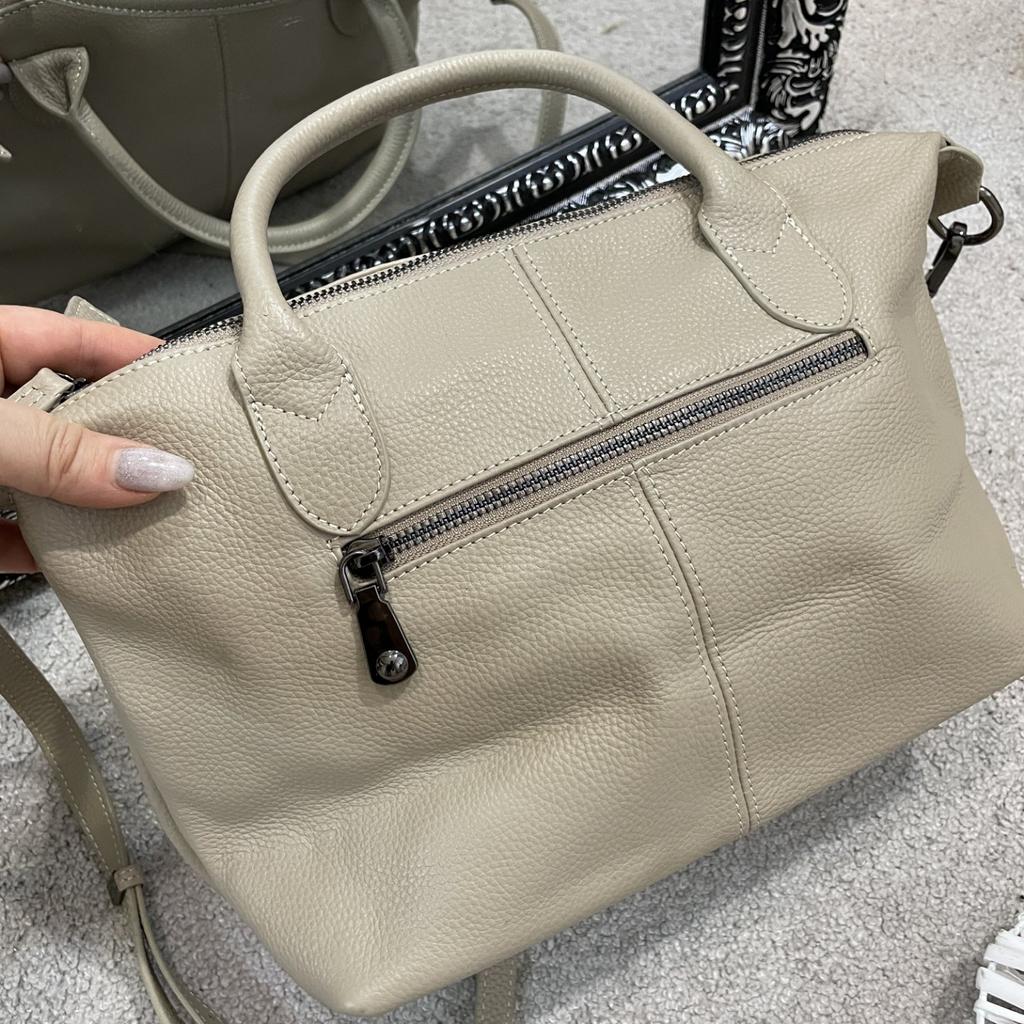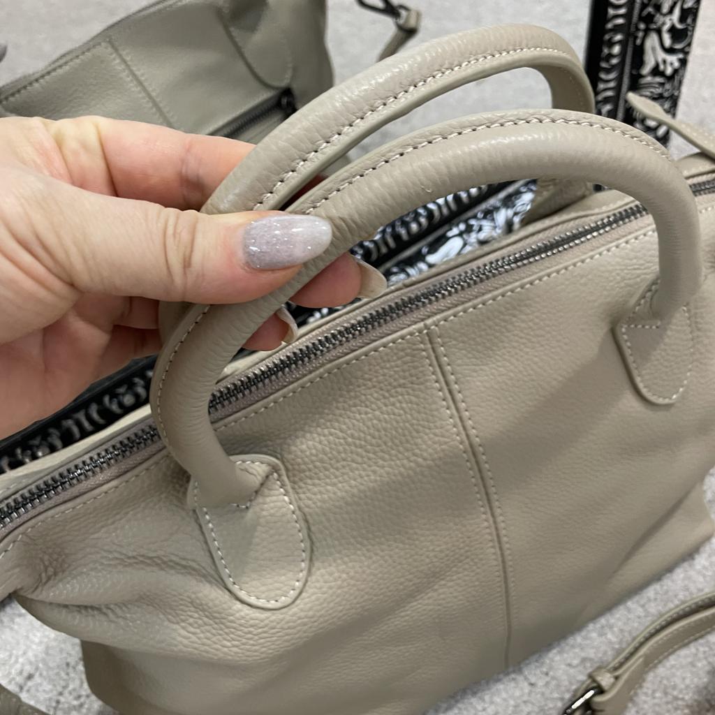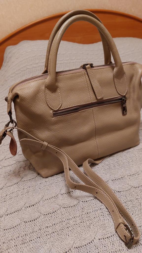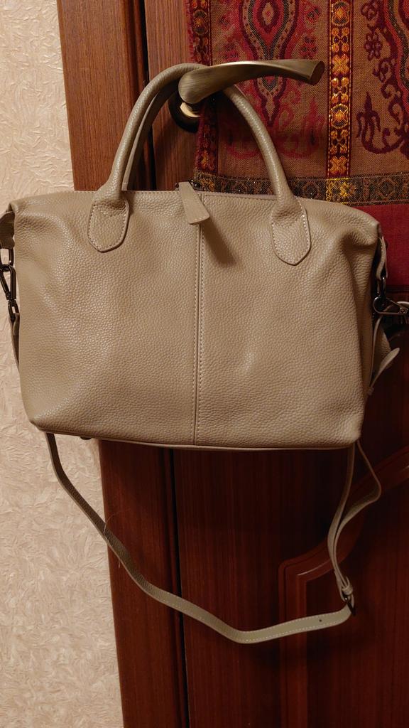 Наконец-то получил долгожданную сумочку. Ждала, когда она будет по адекватной цене. Сумочка очень понравилась и качество пошива, и цвет. Цвет бежево-серый. Пошив аккуратный. Что касается материала, думаю это прессованная "кожа". На сумке прицеплен кусочек натуральной кожи, но это не факт, что сумка из такова же материала. Мягкая, но форму держит. Спасибо Joom. Сумочка вместительная. Ручки и молнии надежные. Спасибо Joom!