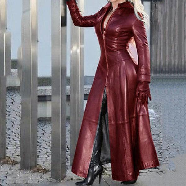 Женская зимняя супердлинная кожаная куртка из искусственной кожи с воротником-стойкой