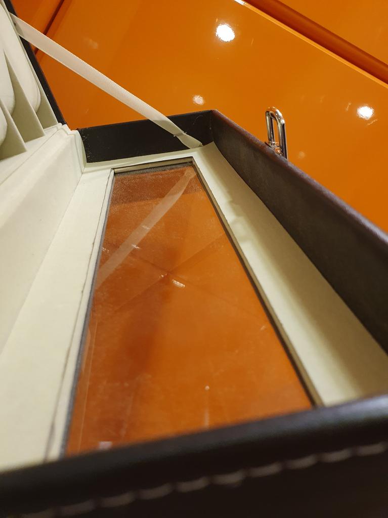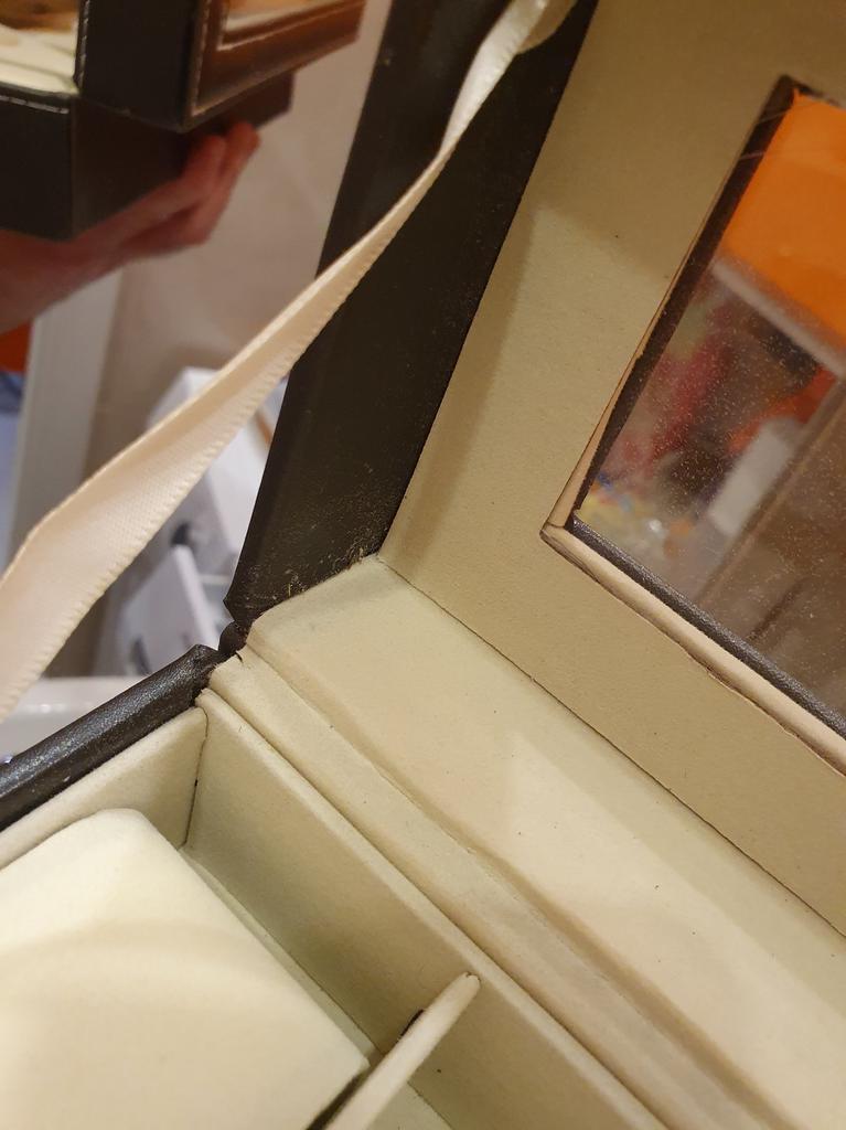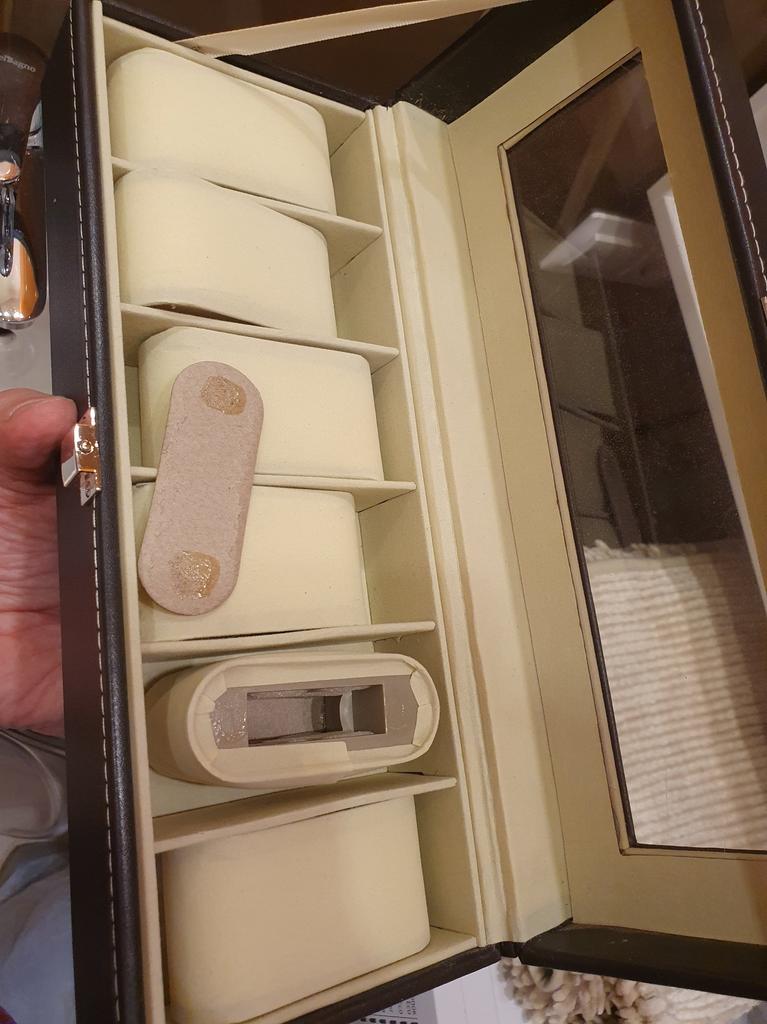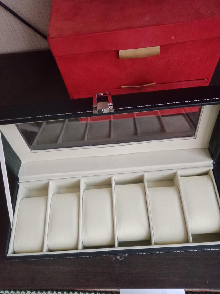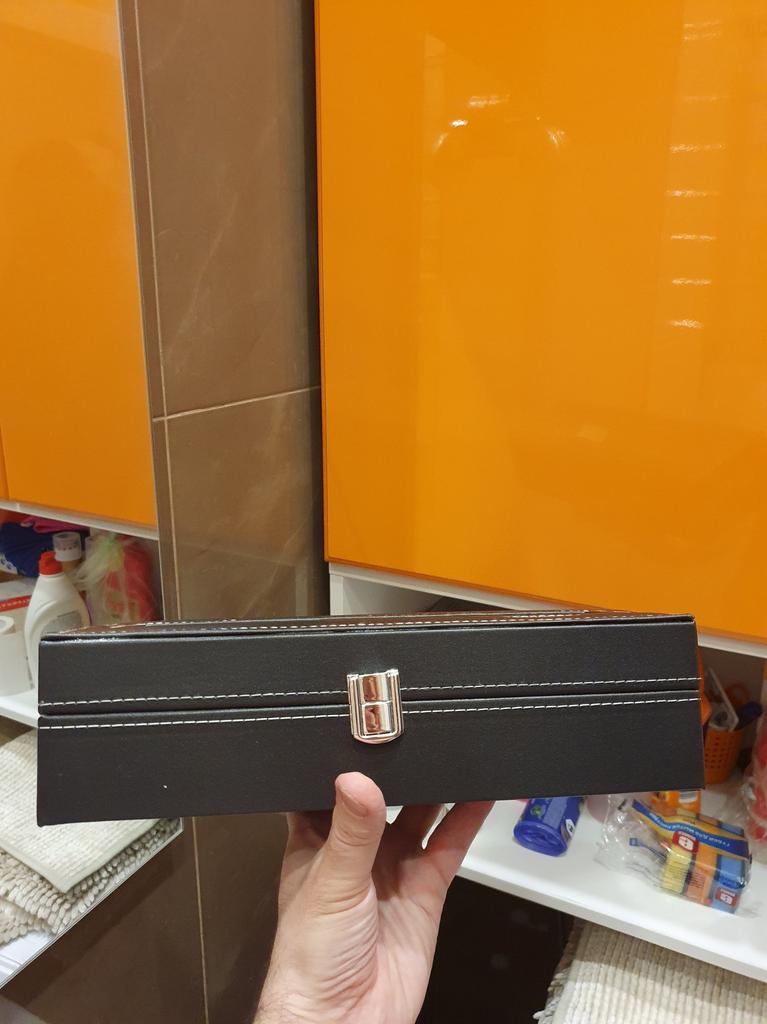 Футляр для хранения часов. Достойный и качественно выполнен. Основа короба наверное дерево, тяжёлый и плотный. Сверху материал кожа. Прошит яркой контрастной строчкой. Закрывается на замочек. Сверху крышки оконце из прозрачного пластика. Ячейки для ремешка покрыты фетровой тканью. Брала для подарка солидному мужчине. Были с супругой очень довольны. Видела такой футляр в Хофф. СтоиТ в 7 раз дороже