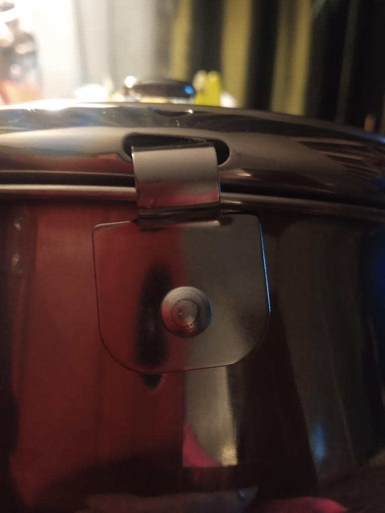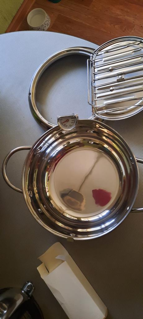 Кастрюлька небольшая, не совсем понятно как по решётке (она совсем маленькая, не на всю крышку, как показано на картинке) стекает лишний жир, так как решётка крепится к крышке и толку в ней мало. Да ещё термометр просто вставляется в отверстие и болтается в кастрюле ничем не закрепляется. Вообщем обычная кастрюля, я немного разочарована. Ещё не готовила, надо посмотреть как будет в использовании.