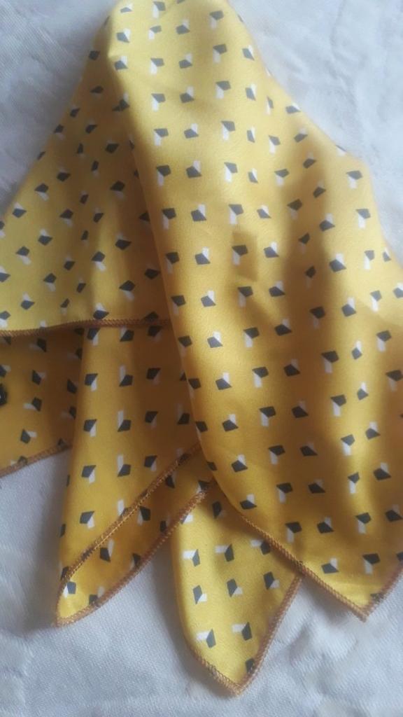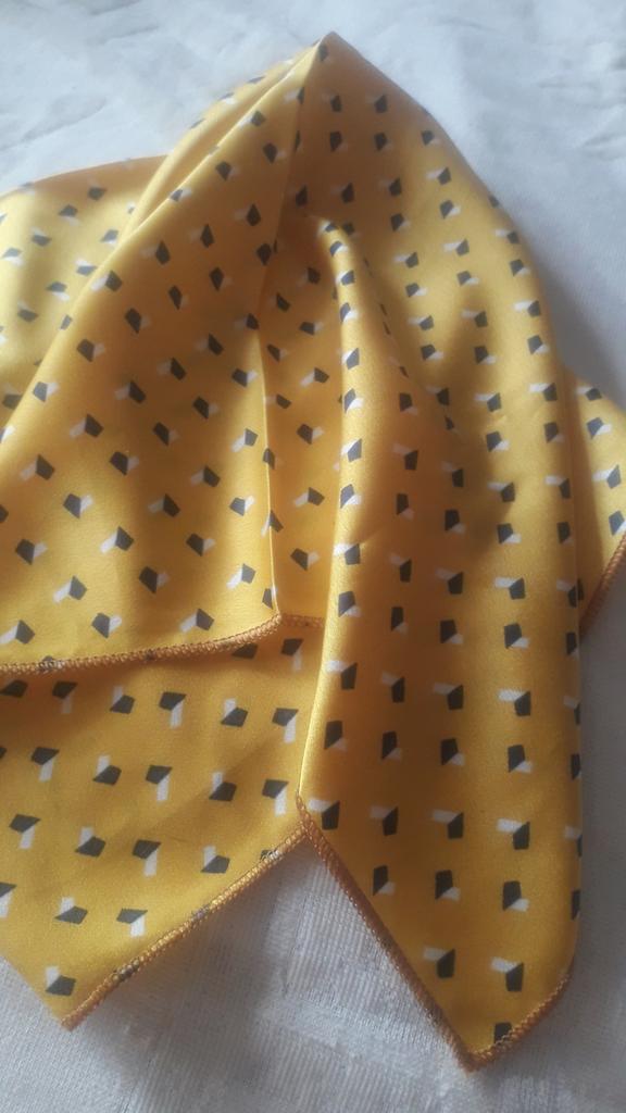 Миленький жёлтый платочек 💛... Доставлен за почти 1,5 месяца, полуживым треком . 🛩 📦 Шейный платочек, или бандана, кому как нравится, из 100 % -го полиэстра с мелким геометрическим рисунком черно-белого цвета . 🤍🖤💛 Края без подгиба, просто оверлочены . Размер немного меньше заявленного . Всего 46 × 48 см. 🤔 Качество нормальное, рекомендую ! 💯 Спасибо, Джум ! 😘