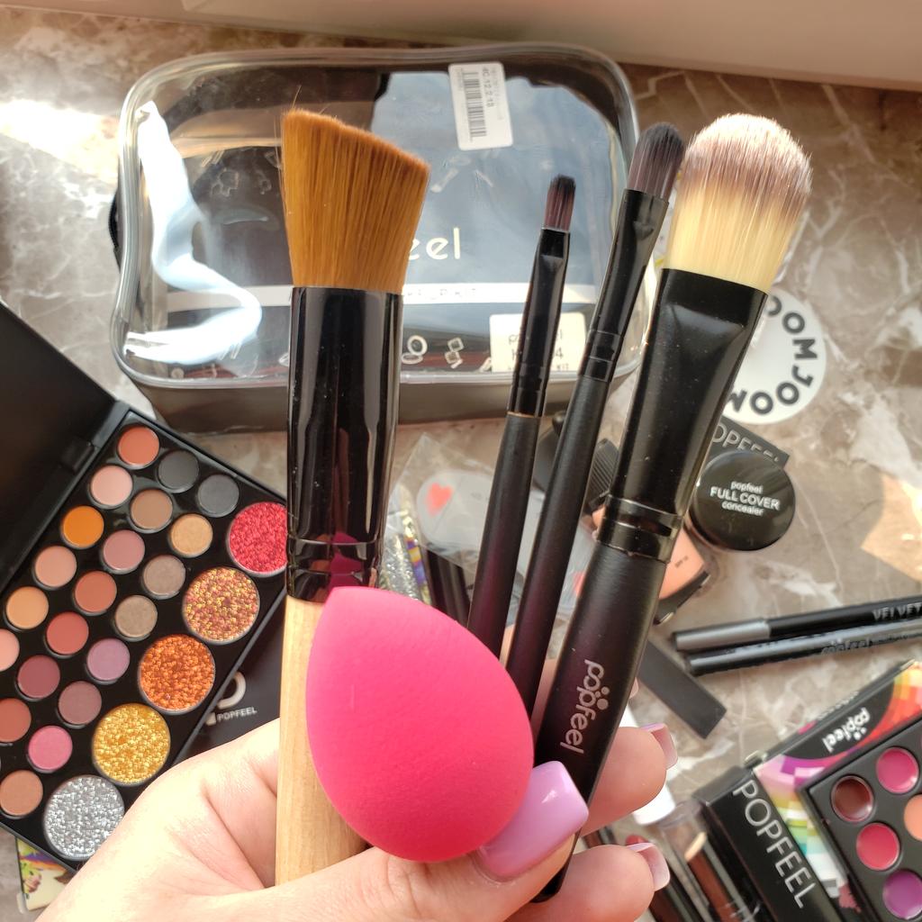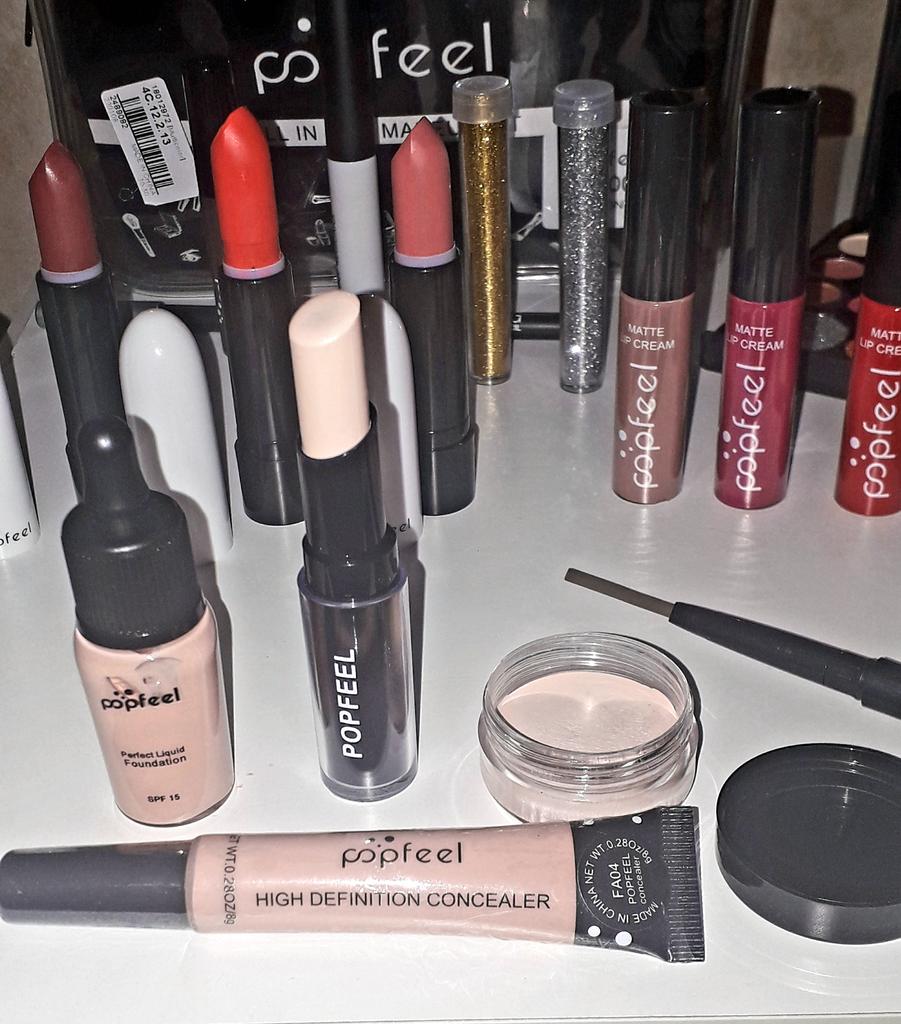 🤯 ОГРОМНЫЙ НАБОР КОСМЕТИКИ Бренд - Popfeel, всего 30 средств, ценник сейчас около 2000 рублей! Буду по порядку, как на фото, чтоб не запутаться. 1 фото - всё вместе 😂 Тени неплохие, мне понравились оттенки + крутые оттенки с глиттером! 2 фото - 4 кисти, для помады, теней, кремовых текстур. Самая левая классная, плотно набита, ворс не лезет. + маленький бьюти блендер для корректоров/консилеров 3 фото - мелочевка, глиттеры россыпью, салфетки для макияжа, трафареты для бровей 4 фото - помады в палетке (кисть для них) и 4 матовых помады популярных оттенков 5 фото - та же палетка и 3 помады, не матовые, увлажняющие. Плюс гигиеническая помада. 6 фото - всё для коррекции: консилеры в баночке и стике, жидкий консилер, тон. Последний странного оттенка, рыжевато-розовый, удивил аппликатор 🙃 7 фото - карандаши для глаз и бровей и тушь. Она такая странная! Очень тоненькая щёточка! Ну и всё это добро в косметичке из ПВХ, влезает как конструктор Лего 😂 Я б заменила консилеры на какие-нибудь запечённые румяна и хайлайтер и было б прям вау, но и так очень круто. Качество косметики не самое плохое, есть конечно и более крутые китайские бренды, но там и цена другая. Для начинающих визажистов прям вау, я б обрадовалась такому подарку, могу рекомендовать!
