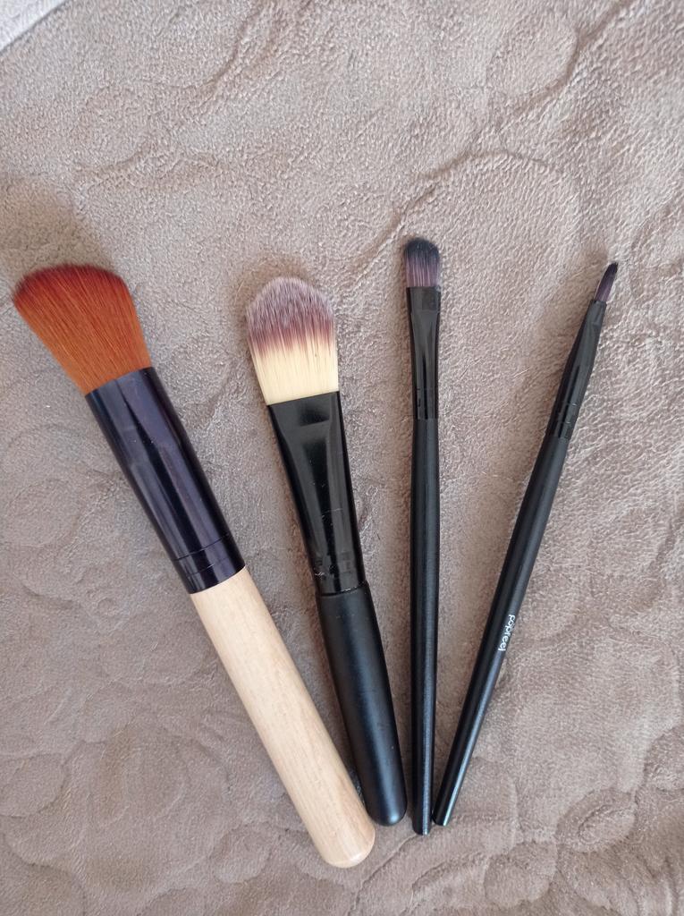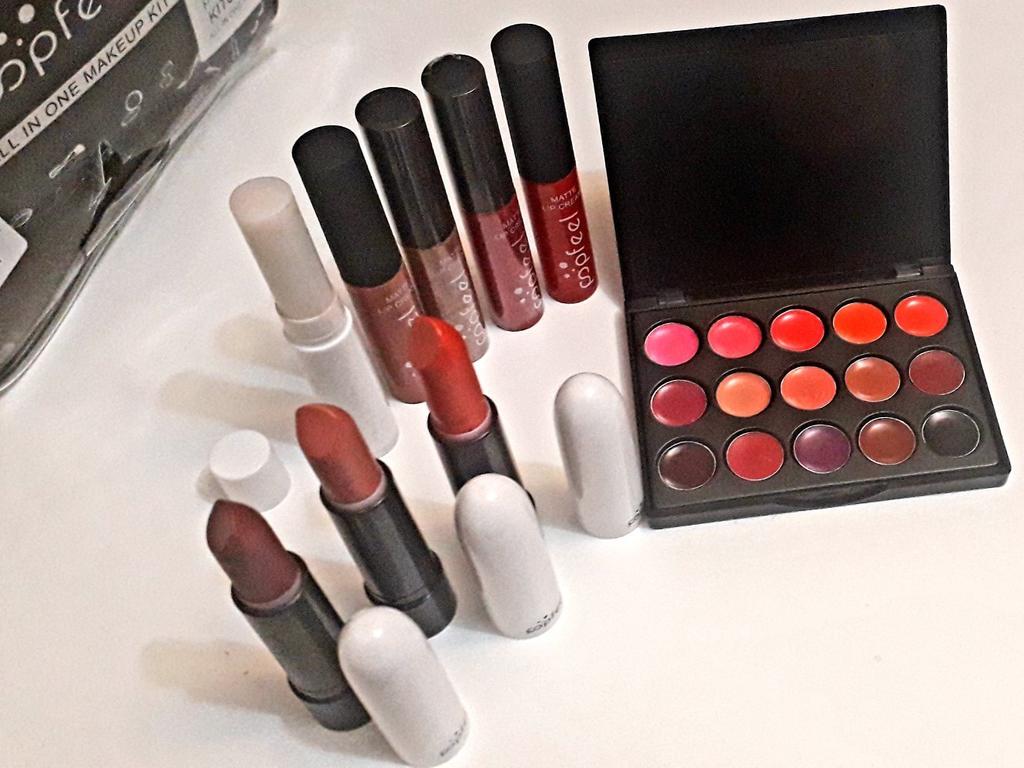Профессиональный набор косметики Пришла сумочка целая, красивая. В косметичку входит: ~1 палетка теней для глаз ~1 палека помад для губ ~4 кисти для макияжа ~1 бальзам для губ ~1 карандаш для бровей ~1 тональный крем ~1 консиллеро ~1 жидкая основа ~3 помады ~1 тушь для ресниц ~ 1 тени для век в виде ручки ~ бумага для снятия макияжа Очень хороший набор, правда все таки есть минусы. Мне не понравились кисти для век, очень жёсткие, веки начинают болеть после них. Основа под макияж мне подошла идеально, тени сыпятся когда наносишь их на глаза.