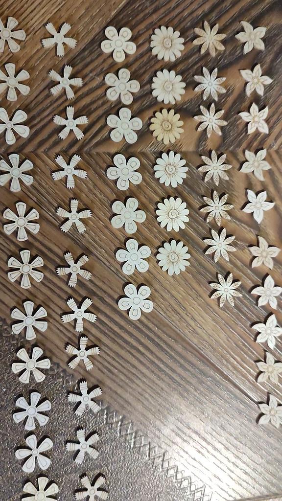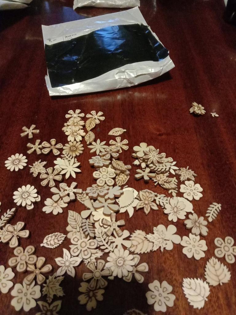 Ровно 100 штук. 8 видов цветов и 5 - листьев. Каждого от 4 до 14 штук. Все целые. Есть "лицевая" сторона с выжженным рисунком. Размер 2 см +-. Доставка без малого два месяца.