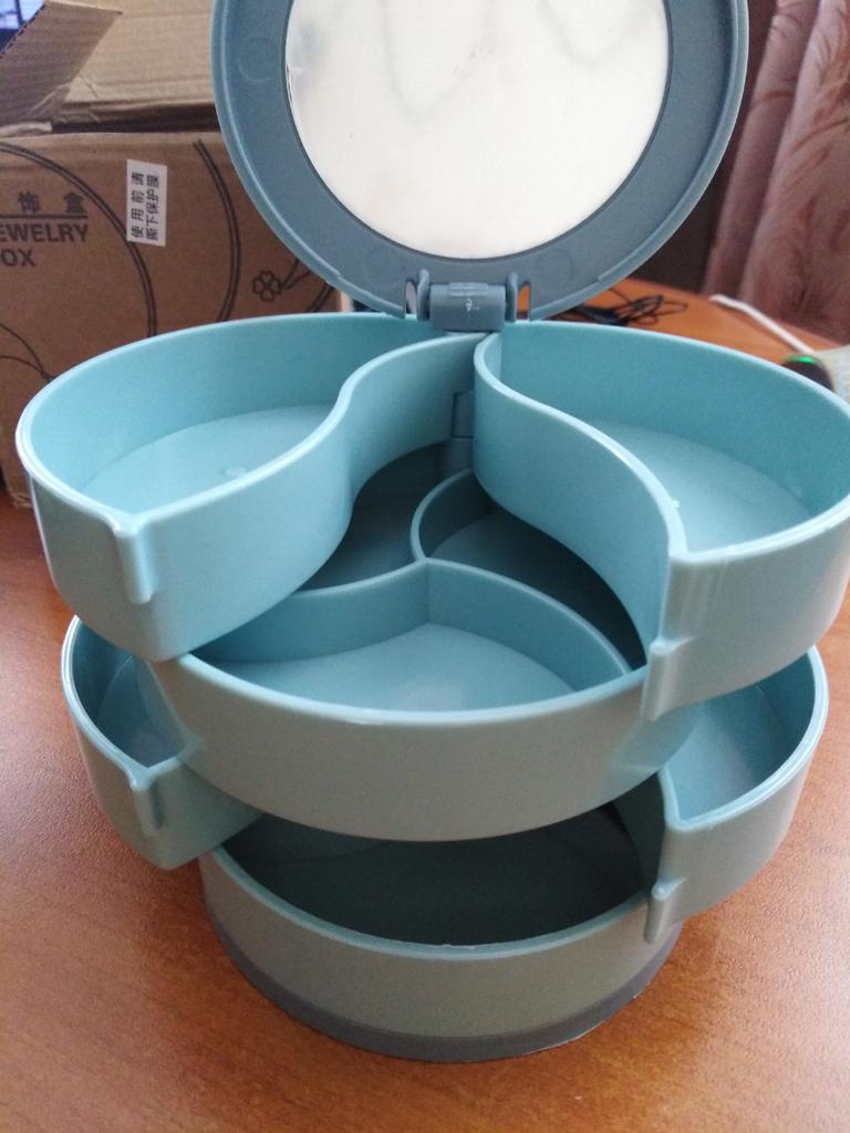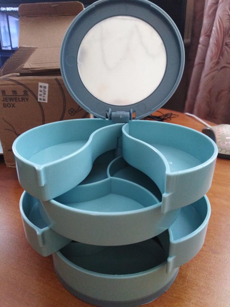 Вращающаяся ШКАТУЛКА - ОРГАНАЙЗЕР ДЛЯ БИЖУТЕРИИ ______________________________ Добавляйтесь в мой Telegram канал Джум_loveблог 💝 🍓Каждый день новые промокоды 🍍Интересные предложения для вас ☕Тёплое общение _______________________________________ РЕКОМЕНДУЮ! Не смотря на его небольшие размеры Высота 10см Ширина 10см. Материал твёрдый пластик . ЦВЕТ СКОРЕЕ МОЛОЧНЫЙ, чем чисто- белый. АБСОЛЮТНО совпадает с цветом в карточке продавца. Глубина ячеек около 2 см. боялась, что будет совсем махонький, а нет, очень даже вместительный. И при этом занимает мало места Его лаконичность и удобная, круглая форма даёт возможность поставить и украсить любое пространство в комнате. При этом шкатулка имеет 4 яруса, два из них разделены на два отдельных отделения для украшений. Все ярусы можно выдвигать и раздвигать, они крутятся во круг своей оси. Есть Зеркало на самой крышке. Но крышку нужно немного разработать, туговато открывается и тоже не можно поворачивать вокруг своей оси. Шкатулка прекрасная во всех отношениях. Мне безумно понравилась!