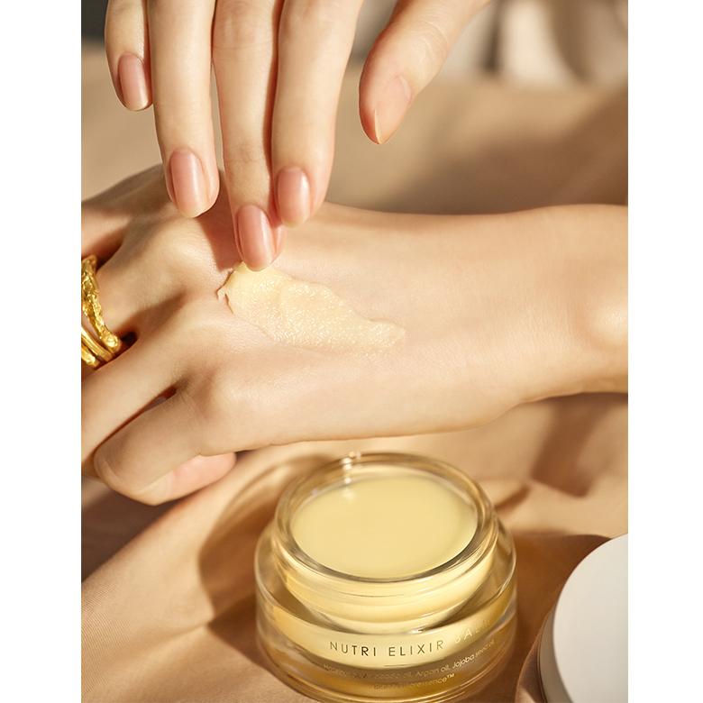 Каштаны Nutri Elixir быстро впитываются без липкости за счет добавления влаги из ингредиентов акации, бузины и нероли, которые помогают успокоить кожу с помощью четырех типов масел: авокадо, хуба и аргана..