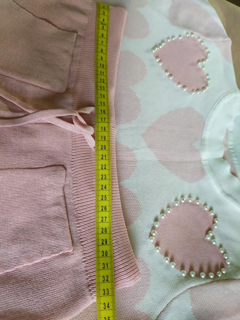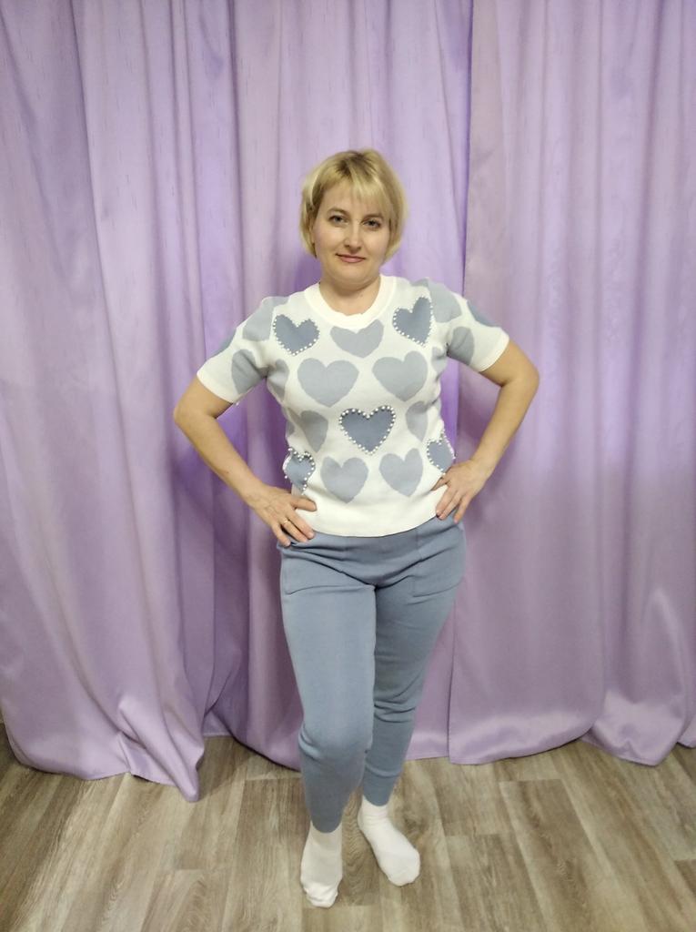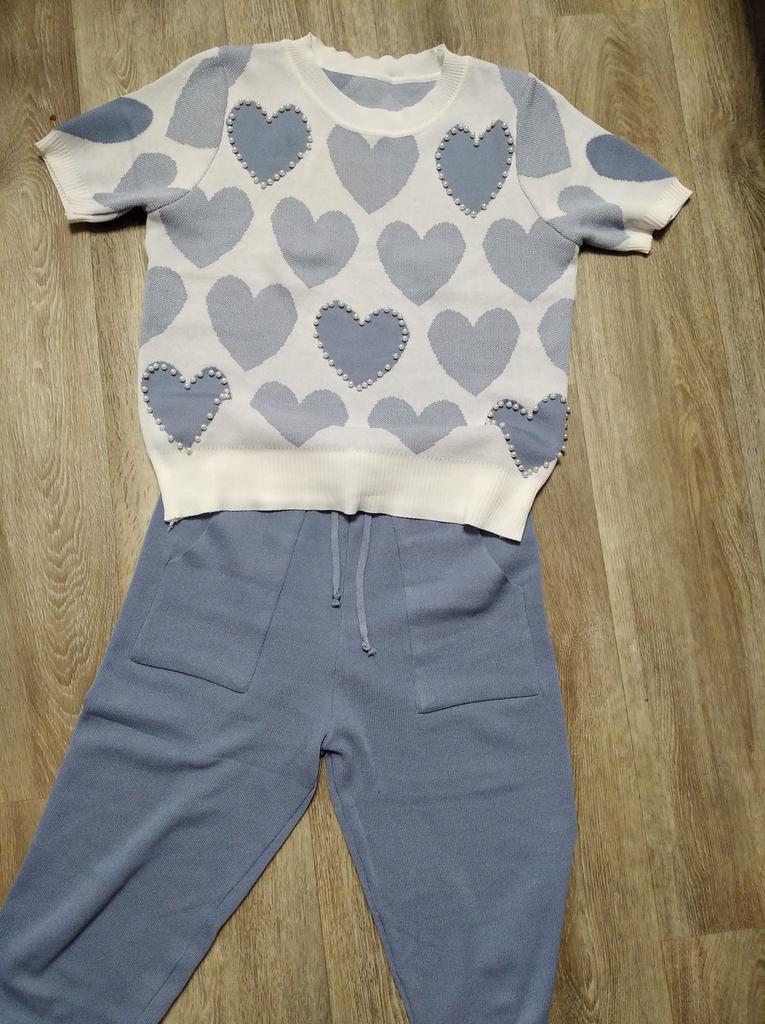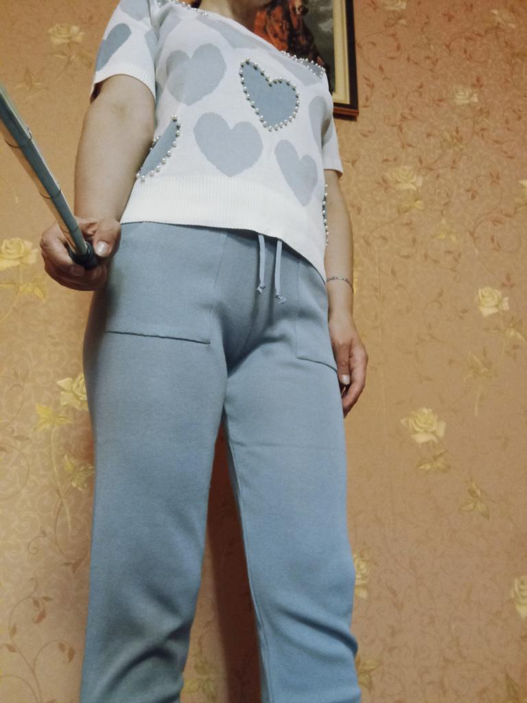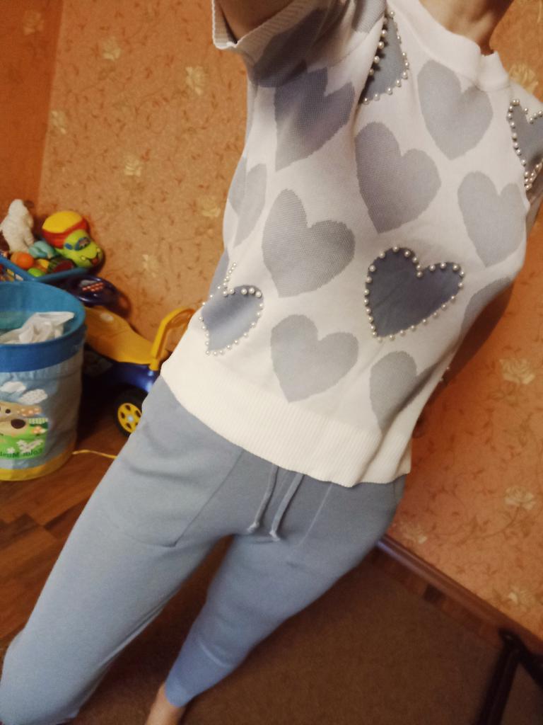 Летний спортивный костюм в нежных оттенках... У меня в голубом цвете... Решила приобрести себе тоже костюмчик, хоть спорт и я - не друзья... Трикотаж тоненький, акриловый... Свои параметры 100-77-100 свободно впихнула в этот один размер....Правда, кофточка коротковата для меня (комфортнее чувствую себя, когда пятая точка прикрыта🤪) Штанишки укороченные, на 155 см длина только-только... Очень понравился костюм своим оформлением в виде сердечек с бусинами... Правда, после пару раз телодвижений на полу штанишки в коленях растянулись🤔🥴... Думаю, можно собрать разные варианты в одежде с кофточкой...