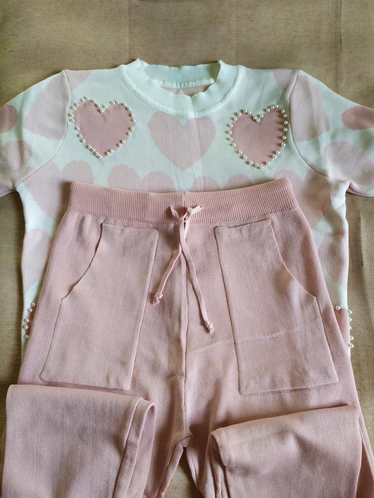 Модный женский трикотажный костюм с принтом сердец : свитер с коротким рукавом и брюки на шнурке в поясе