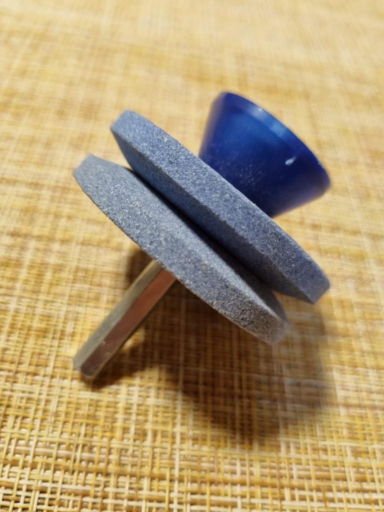 Шлифовальная насадка на дрель или шуруповёрт для заточки садового инструмента, ножей и других режущий инструментов https://at.joom.com/dl/T1MKWWZcL3LbWAnq9 Представляет собой два абразивных колеса диаметром 5,5 см насаженных на шестигранную ось, длиной примерно 6,5 см. В пластиковом конусе стопорным кольцом зажата пружина чтобы камни могли немного расходиться.
