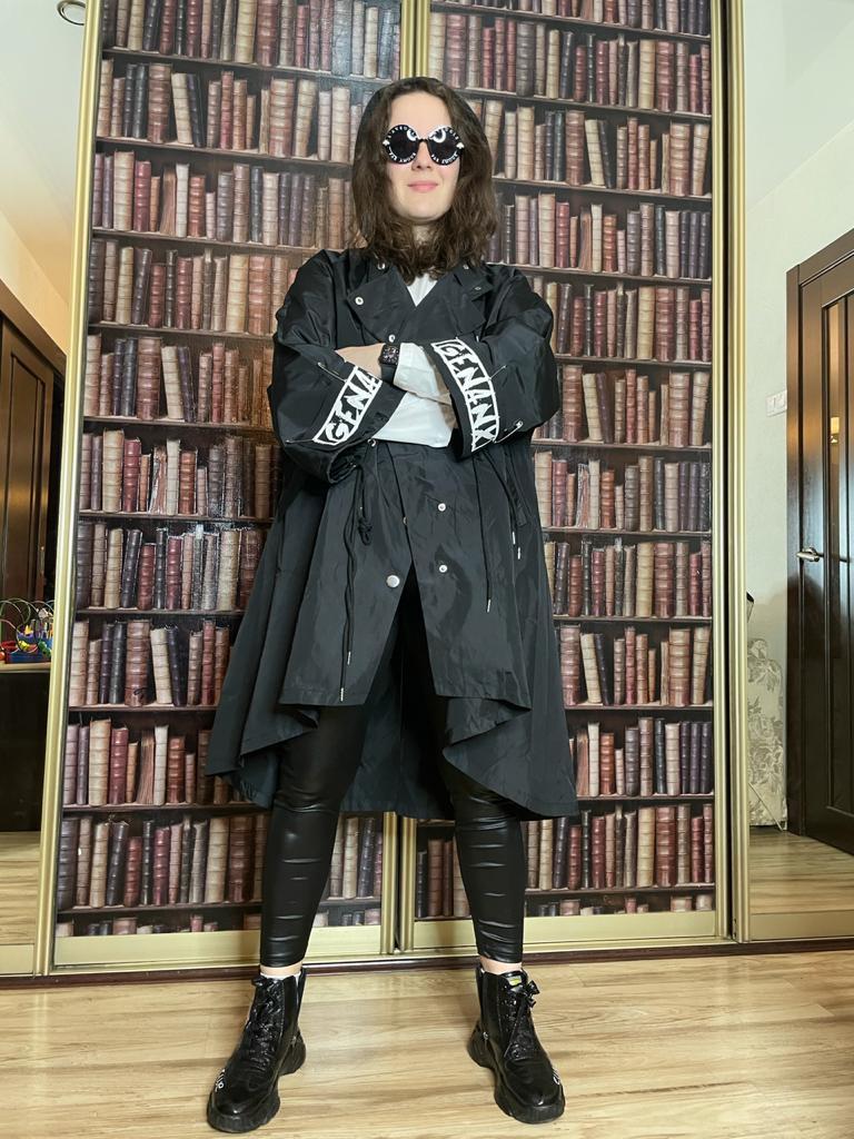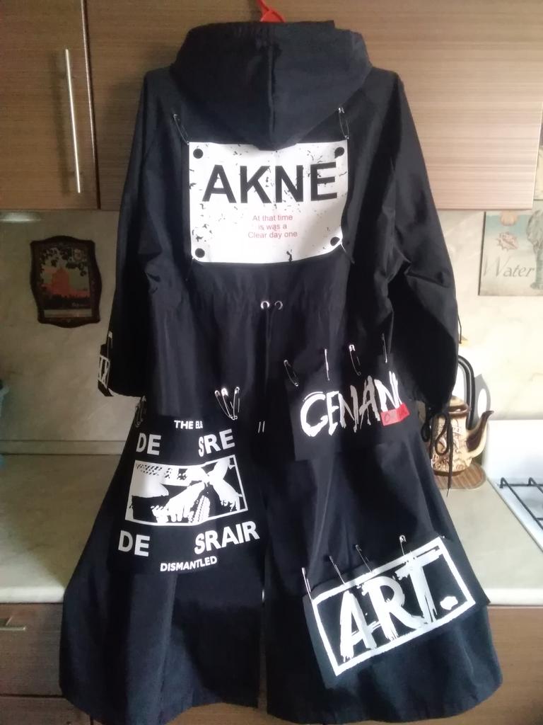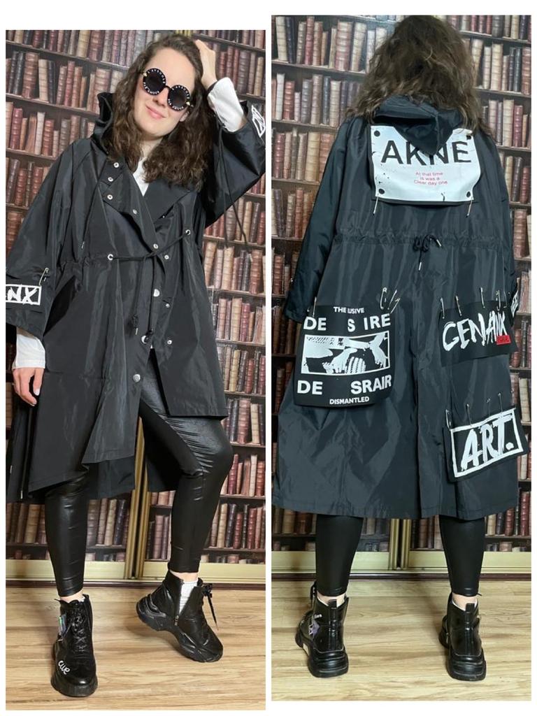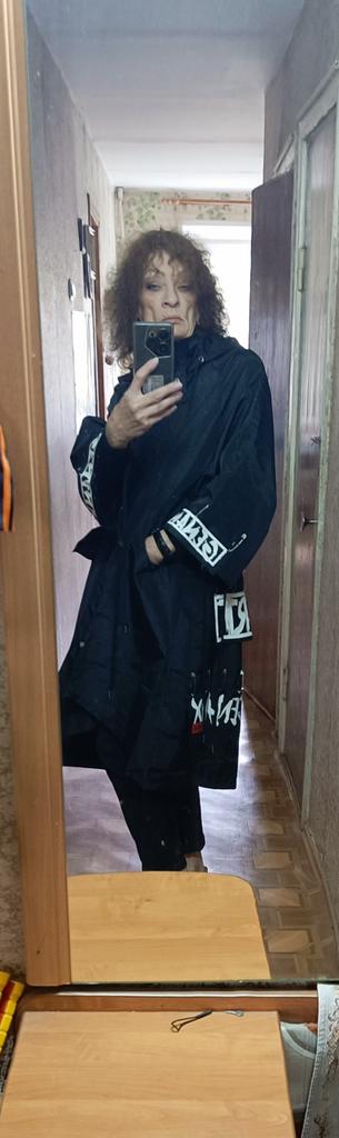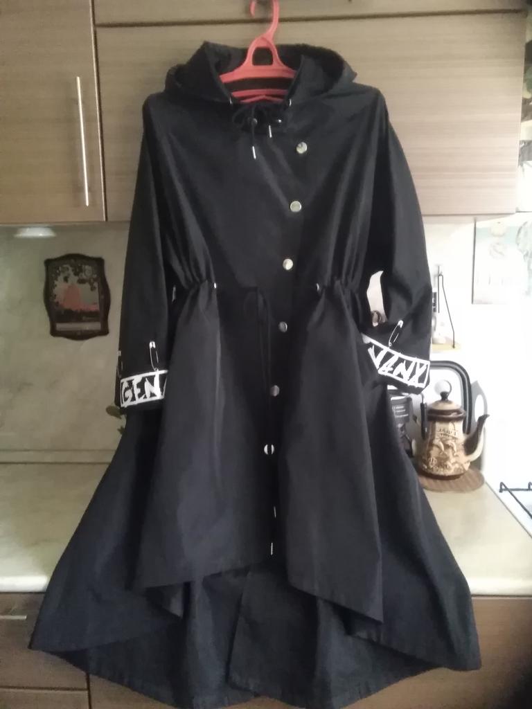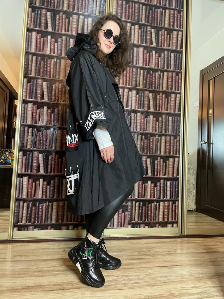 Моя большая благодарность за великолепный дождевик. Приветствую и делюсь радость! Это отличная покупка. Жаль фотографии не передают всего великолепия... Плащ одного размера. На мой 50 сел оверсайз. Но! Крой прекрасный. Плащ вытягивает фигуру, в реальности смотришься в нем на пару размеров меньше. Выглядит элегантно и современно, немного странно. Короче, то что надо! ))) В тоже время, если вы любите, чтобы вещь сидела как влитая (это не моё совсем, предпочитаю, чтобы моя одежда была немного "великоватой"), подумайте стоит ли экспериментировать. Качество пошива фабричное. Ни к чему не придерёшся. Строчки, шнурки, фурнитура - всё идеального качества. Материя не промакайка. Подобные плащи ( по материалу) были в моём детстве, и мне давно хотелось такой плащ на лето. Плащ хорошо защищает от дождя и неплохо от ветра. Но! При этом ткань дышит. Есть у меня недышащие вещи, есть с чем сравнить. Это дождевик без подкладки. Все швы изнутри спрятаны, что очень приятно. Как уже писали многие до меня, все надписи крепятся булавками, можно снимать, можно варьировать и перевешивать. На моих фото нет верхней не потому, что мне не нравится, просто я в день фотосессии )) много ездила на машине, и верхняя надпись цеплялась за чехол сиденья. Побоялась чего-нибудь испортить и сняла на время. Капюшон удобный, с функцией своей справляется прекрасно. Сейчас это у меня одна из самых любимых вещей! Посмотрела снова предложения фирмы. Да, этот уличный стиль с его гротеском и юмором моя настоящая любовь. Рада, что здесь появились не только чёрные вещи. Обожаю черный, но у меня две белый кошки...