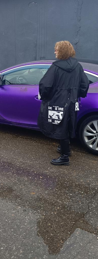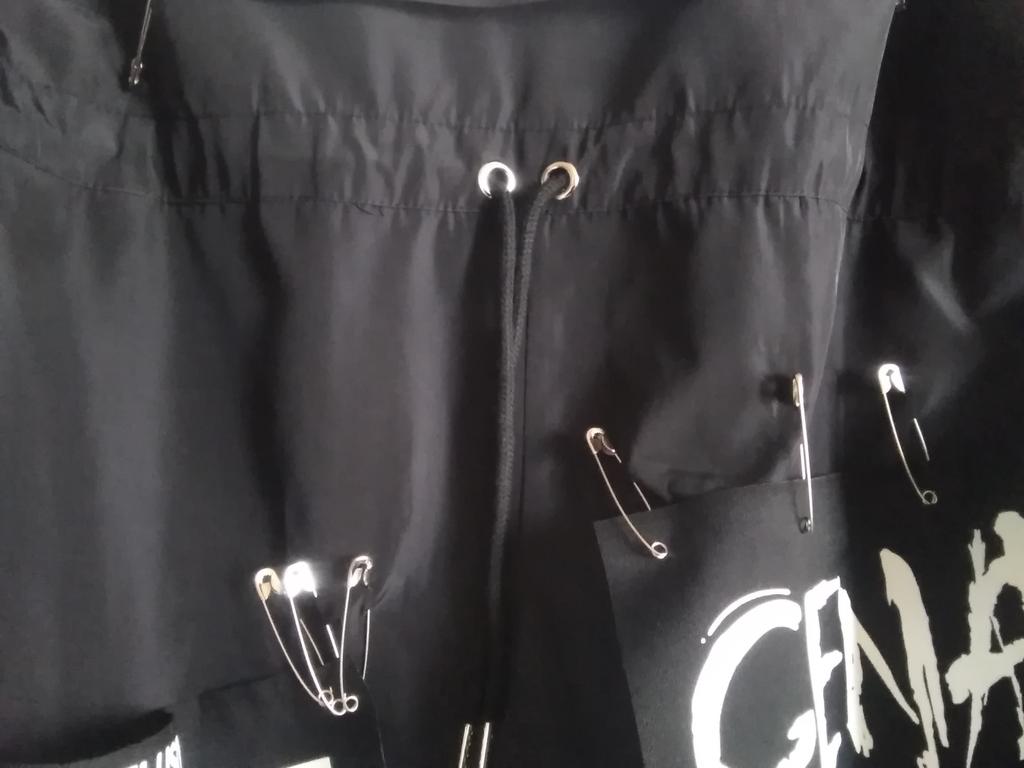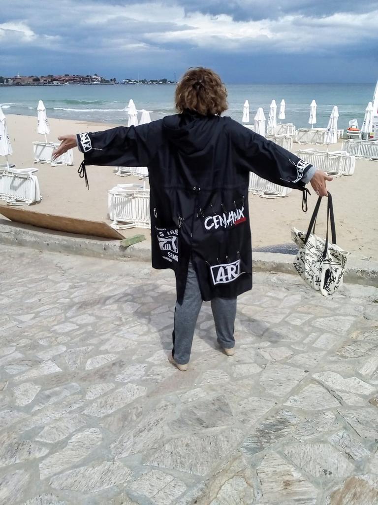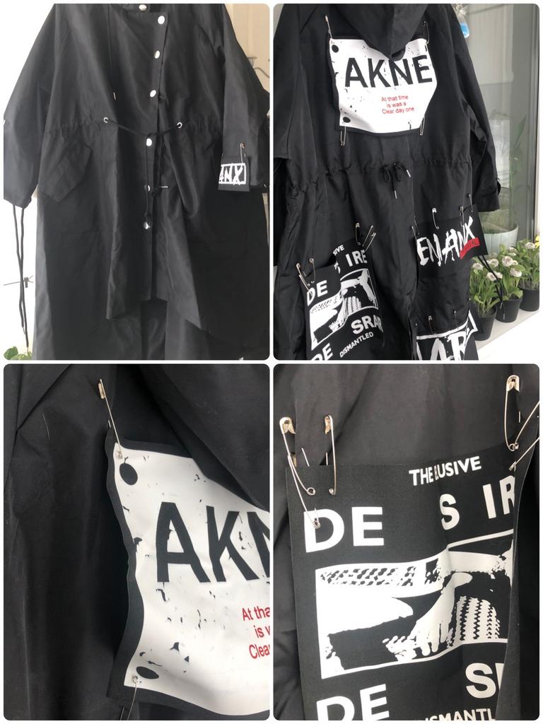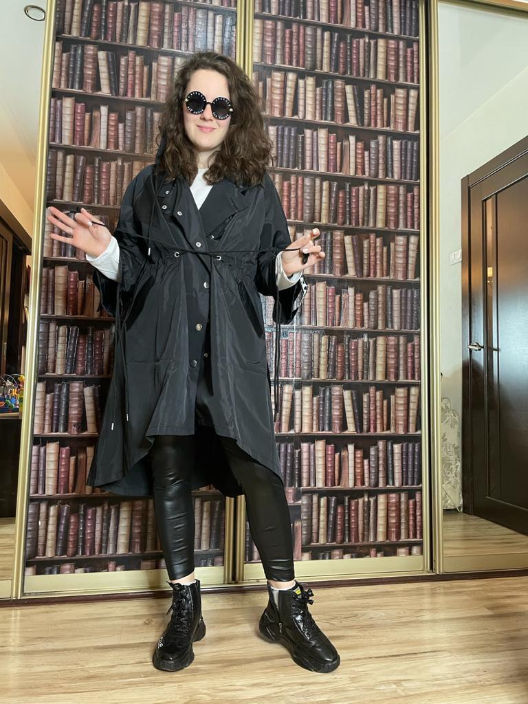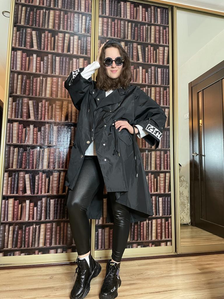 Моя большая благодарность за великолепный дождевик. Приветствую и делюсь радость! Это отличная покупка. Жаль фотографии не передают всего великолепия... Плащ одного размера. На мой 50 сел оверсайз. Но! Крой прекрасный. Плащ вытягивает фигуру, в реальности смотришься в нем на пару размеров меньше. Выглядит элегантно и современно, немного странно. Короче, то что надо! ))) В тоже время, если вы любите, чтобы вещь сидела как влитая (это не моё совсем, предпочитаю, чтобы моя одежда была немного "великоватой"), подумайте стоит ли экспериментировать. Качество пошива фабричное. Ни к чему не придерёшся. Строчки, шнурки, фурнитура - всё идеального качества. Материя не промакайка. Подобные плащи ( по материалу) были в моём детстве, и мне давно хотелось такой плащ на лето. Плащ хорошо защищает от дождя и неплохо от ветра. Но! При этом ткань дышит. Есть у меня недышащие вещи, есть с чем сравнить. Это дождевик без подкладки. Все швы изнутри спрятаны, что очень приятно. Как уже писали многие до меня, все надписи крепятся булавками, можно снимать, можно варьировать и перевешивать. На моих фото нет верхней не потому, что мне не нравится, просто я в день фотосессии )) много ездила на машине, и верхняя надпись цеплялась за чехол сиденья. Побоялась чего-нибудь испортить и сняла на время. Капюшон удобный, с функцией своей справляется прекрасно. Сейчас это у меня одна из самых любимых вещей! Посмотрела снова предложения фирмы. Да, этот уличный стиль с его гротеском и юмором моя настоящая любовь. Рада, что здесь появились не только чёрные вещи. Обожаю черный, но у меня две белый кошки...