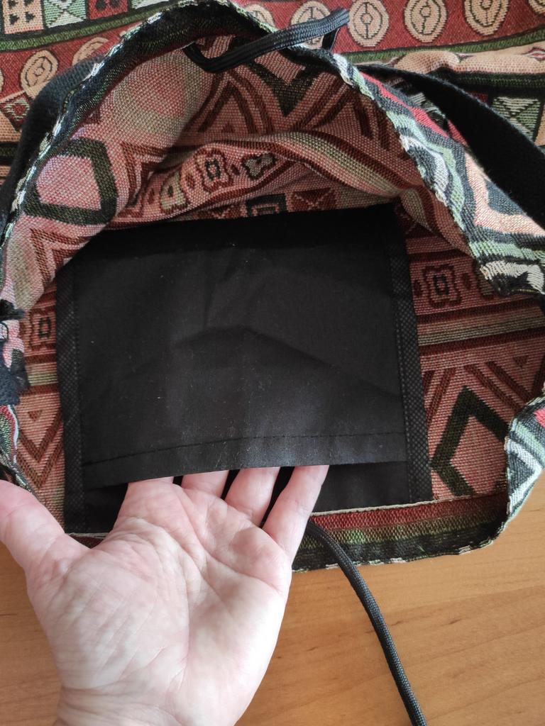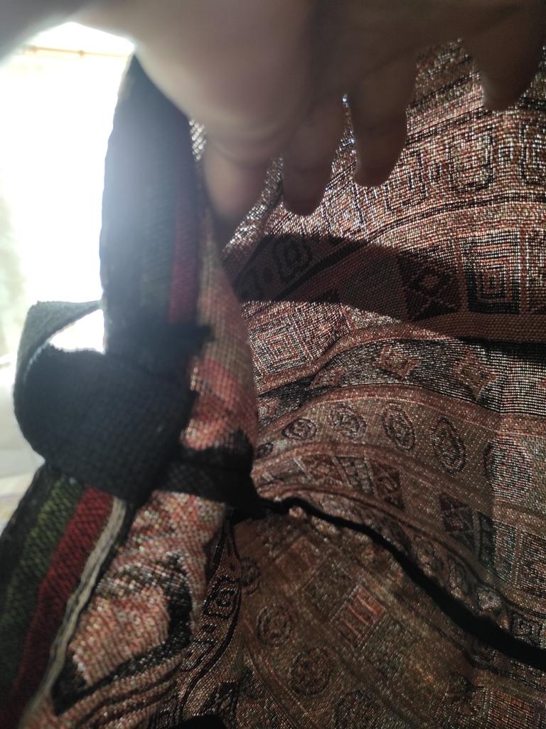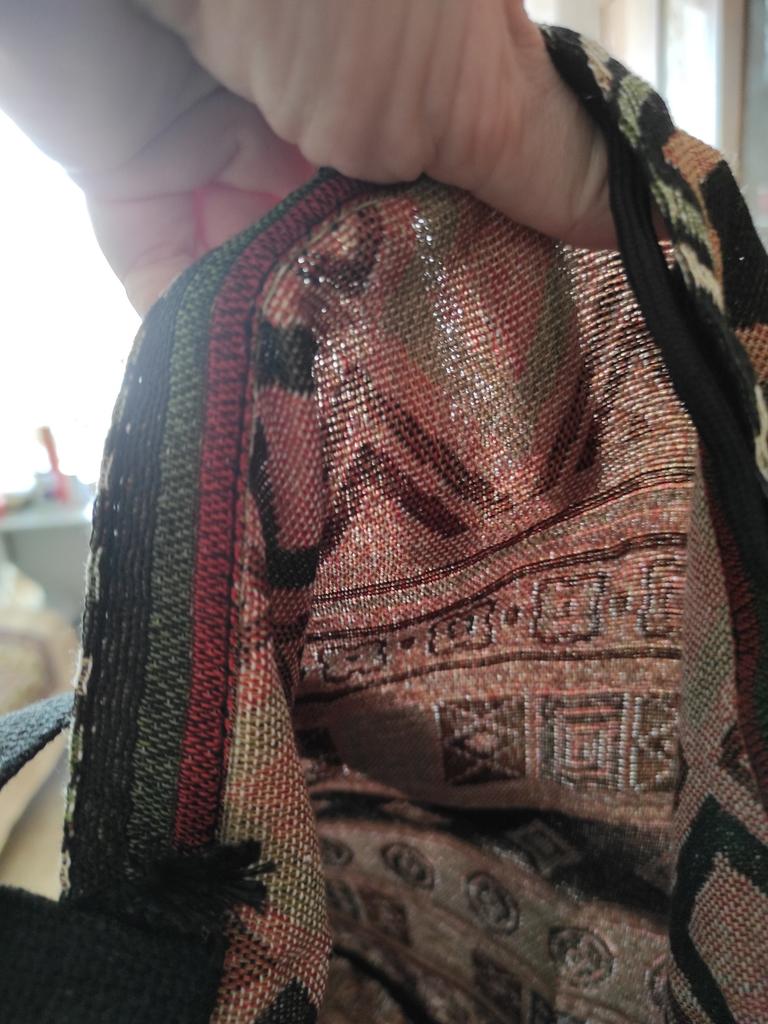 Сумка - супер! Очень красивая. Сразу скажу почему минус звезда. Потому что материал хотя и натуральный, но рыхлый. Без подкладки такая сумка долго не выдержит и нужно следить, чтобы не дай бог что-то с углами положить. В общем нужно делать плотную подкладку самостоятельно. А в остальном хорошая. Хлопок. Очень приятный на ощупь. Тканый узор. Ручка тоже хлопок, уже плотный, как надо. Размер классный. Скетч бук влезет и планшет и много чего ещё. Есть завязки и карман внутри. Карман из какой то синтетической ткани, которые не шьют а запаивают. В общем если делать подкладку из плотного материала, то лучше из него же сделать и карман. Как полуфабрикат - отлично. Довести до ума и будет шикарно!