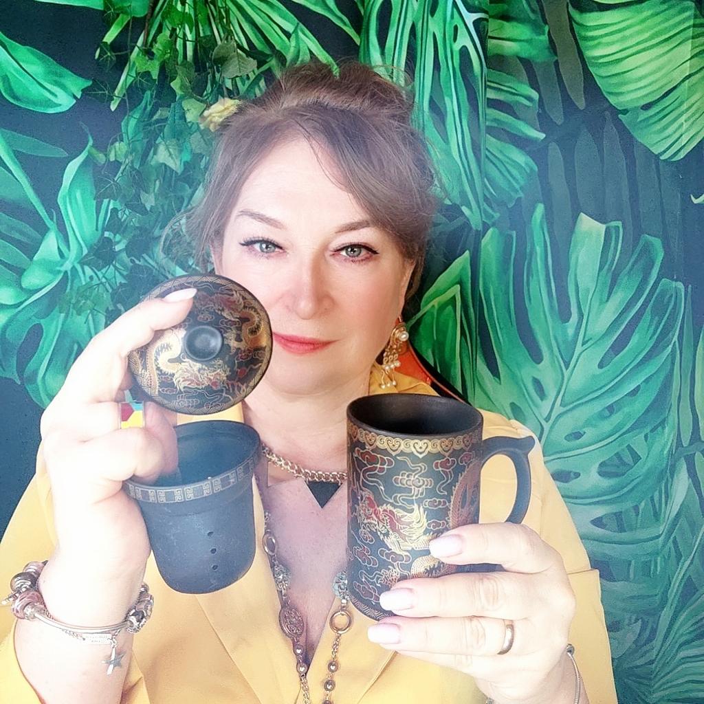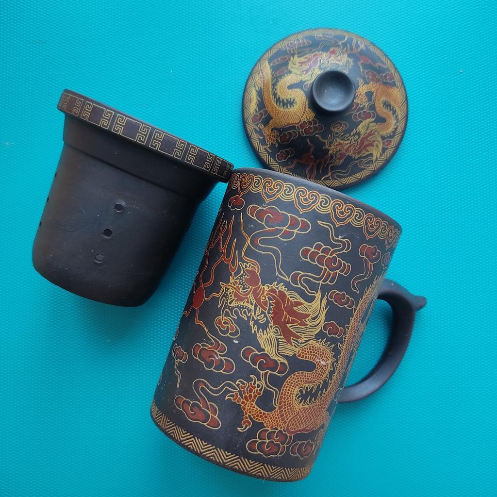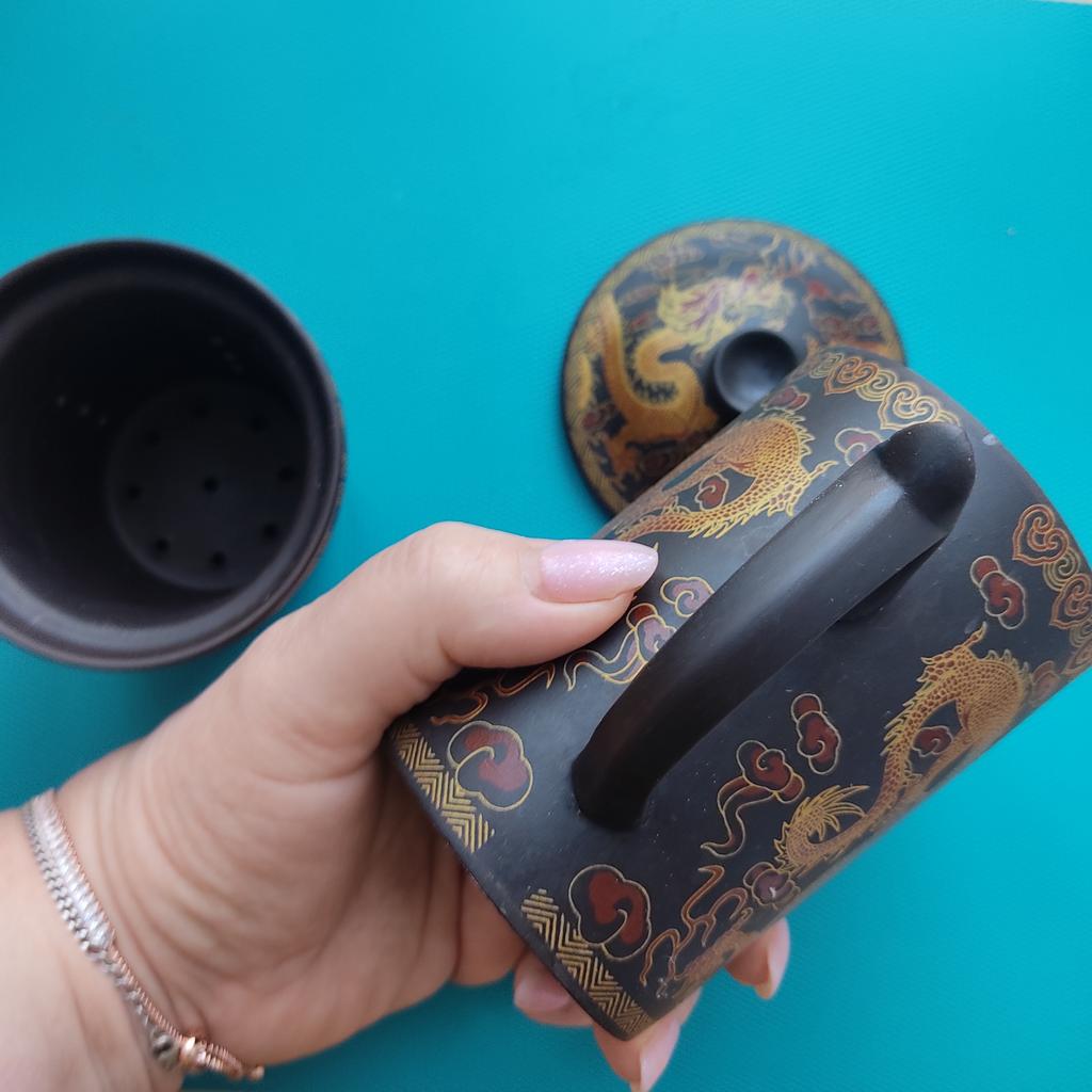 🐉Необыкновенная, экзотическая кружка ручной работы из исинской глины!🐉 Я давно хотела кружку именно из этой глины! Кстати, когда я её заказывала в названии продавца было указано что это кружка из Исина. А сейчас только в описании указано, что это фиолетовая глина... На самом деле это не точный перевод, глина не фиолетовая, а пурпурная. Именно такая и ещё всякая-разная, добывается в уезде Исин в Поднебесной. Она обладает рядом необыкновенных свойств и славится по всему миру. О свойствах этой глины кратенько в конце отзыва, кому интересно. Кружка полностью ручной работы 👍 Там по моей ссылке есть куча разных расцветок; у меня вторая. Кружечка тёмно-коричневая и расписана золотой и темно-красной краской. изображены два дракона🐉🐉, а между ними какая-то красная точка, вокруг облака огня, ибо драконы огнедышащие❤️🔥 И всё это украшено меандром по краю кружки, фильтра и крышки. Сама кружка состоит из 3 частей: крышка, кружка и фильтр всё из глины. В фильтр закладываем чай, в кружку наливаем кипяток, вкладываем фильтр в кружку и закрываем крышкой. Фильтр вынимаем вместе с использованной заваркой. Ее очень легко вытряхнуть и процесс мытья кружки облегчается. А чай в кружке очень-очень долго не стынет, и ручка при этом остаётся холодной👍😁 Справка. ✔️В исинской глине много каолина, который придает блеск и пористость, благодаря которой кружка пропускает внутрь кислород и позволяют чаю «дышать». ✔️Благодаря высокой температуре обжига изделия из исинской глины очень прочные. Они быстро нагреваются и долго держат тепло,а ручка никогда не нагревается. ✔️Из-за пористой структуры эфирные масла впитываются стенками чайника, и такая кружка улучшает вкус чая, делает его мягче, глубже, добавляя свой собственный уникальный «вкус » от накопленных эфирных масел.