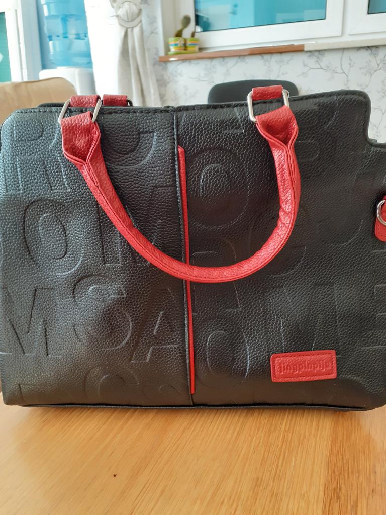 Сумочку заказала 09.03.22 Получила 20.04.22 в почтовом терминале В 1 пакете-сразу 2 заказа. Уппковка без повреждений Все как на фото соответствует! Сумочка черного цвета с красной отделкой. Молнии все работают, внутри состгит из 2 отделений, каждое на молнии. Дно сумочки на 4 подставочках имеется длинный ремень , который можно пристегивать и носить на плече. Она небольшая размеры соответстауют заказу. Оригинальная и симпатичная. Продавцу и службе достпвки 5+