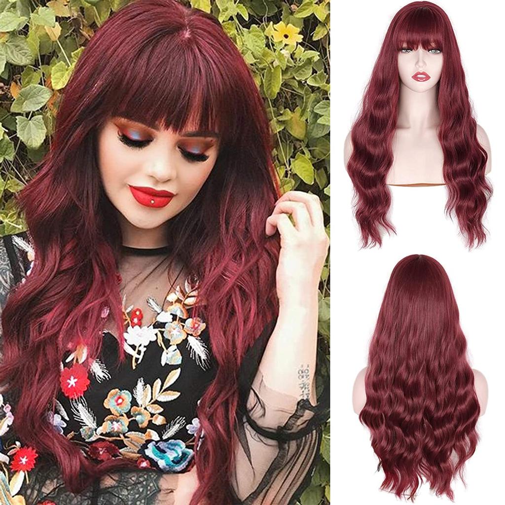 MERISIHAIR Длинный волнистый парик с челкой, винно-красные парики для чернокожих женщин, темно-бордовый синтетический волнистый вьющийся парик 24 дюйма