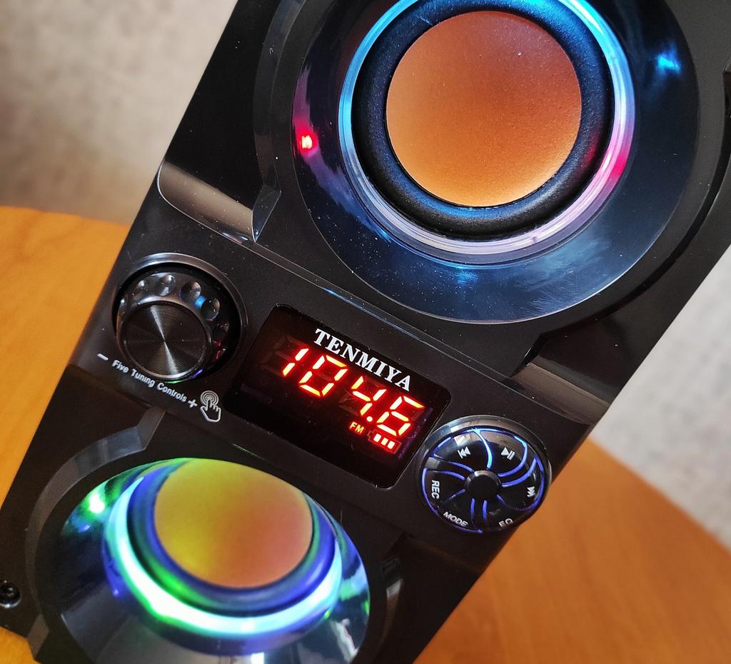Колонка звучит хорошо, но есть нюансы которые мне не понравились. Минусы: 1) выключатель (пинек) это прошлый век, 2) световые ленты просто мигают, к музыке никакой привязки, 3) отключить подсветку когда не нужна невозможно, её бы на этот древний выключатель питания, 4) включение/выключение/переключение режимов сопровождается звуковым сигналом, зачем так сделано? 5) при включении колонки с пинька всегда начало на режим блютуз со звуковым сигналом и начальной не тихой громкостью, почему так? Память на последнем режиме почему не сделать? 6) экран простоват, не хватает информативности (название радиоволны, трэка и т. п.) 7) при автопоиске радиоволн нашёл и сохранил по моему 45 волн, 2 из них ложные там просто шум, их не убрать 8) с колонки перелистывание трэков с карты это трэш, только по одному кнопкой дальше. Почему не так как например на авто крутилкой пролистать? Только пульт поможет перепрыгнуть если много трэков 9) при установке подставки для телефона ручка для переноски упирается в эту подставку (не додумали детали) Вот такой отзыв за 3 дня использования