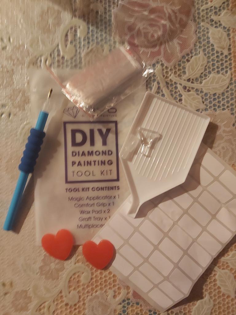 Все пришло, почта как всегда отличилась - угол немного помяли. Продавец положил в подарок дополнительный набор, на фото видно. В наборе: лоток, карандаш для страз и к нему 2 насадки, 2 клея в форме сердечек, зиппакеты, наклейки на пакетики для подписи. Ммм приятно!!!