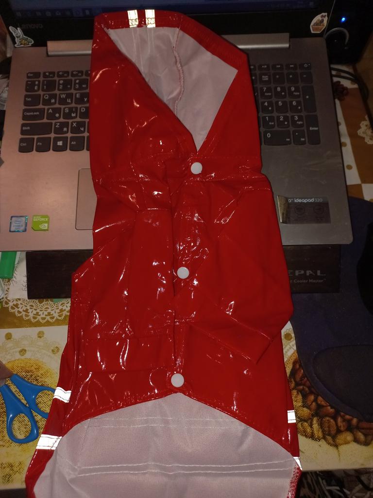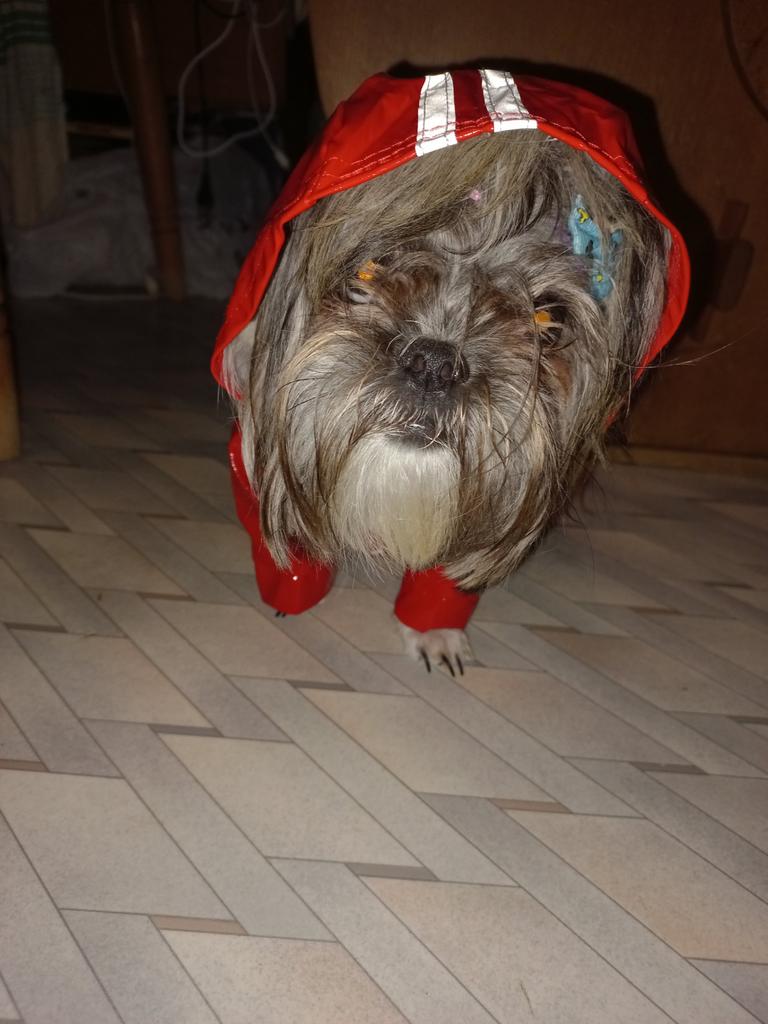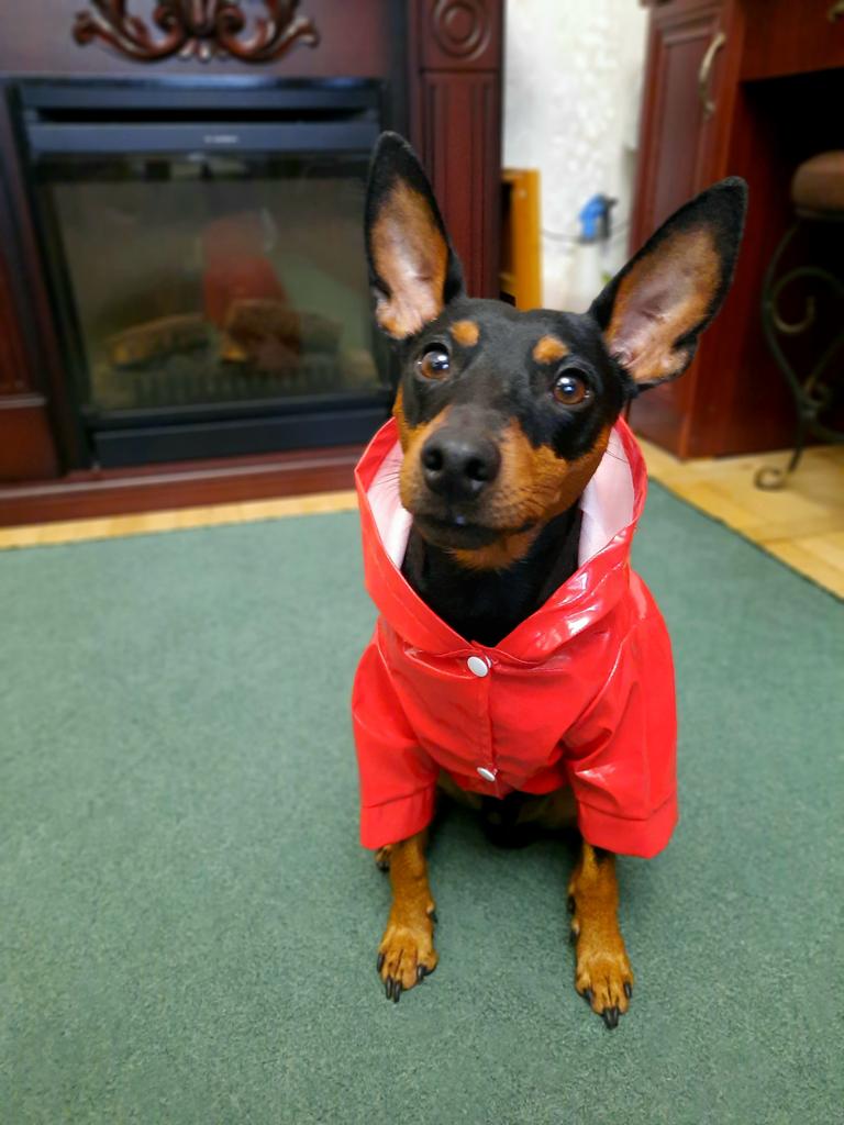 Дождевик неплохой, брала для шитцу по весу. По размерам она у меня мини, лапки коротковаты и в длину чуть длинный, но думаю, что если бы заказала на размер больше, то в объёме скорее всего была бы мала тем более что на осень-зиму налысо туловище не стрижем. Есть петелька для поводка, так что можно надевать поверх сбруйки