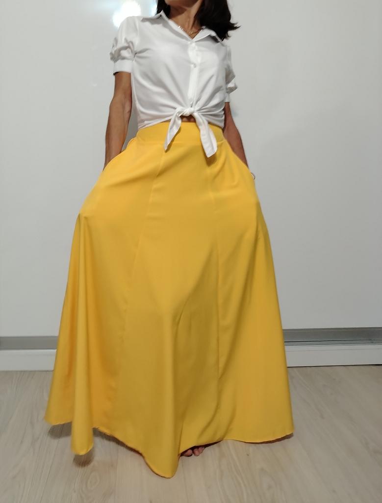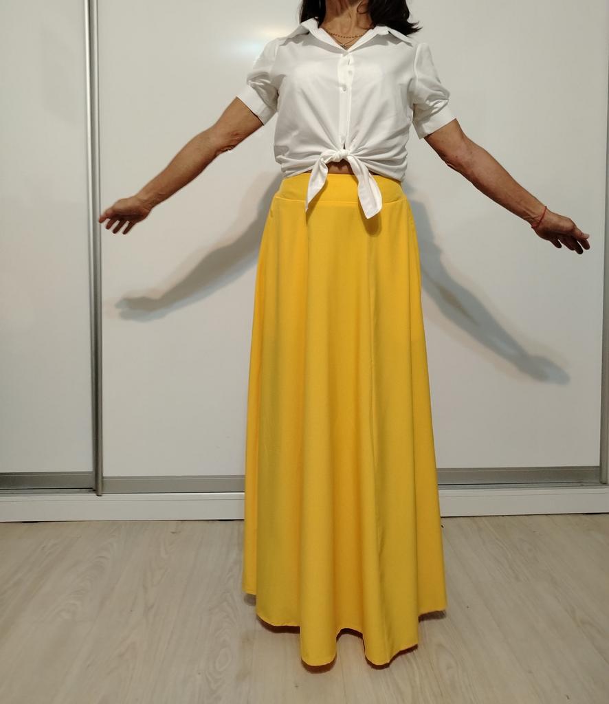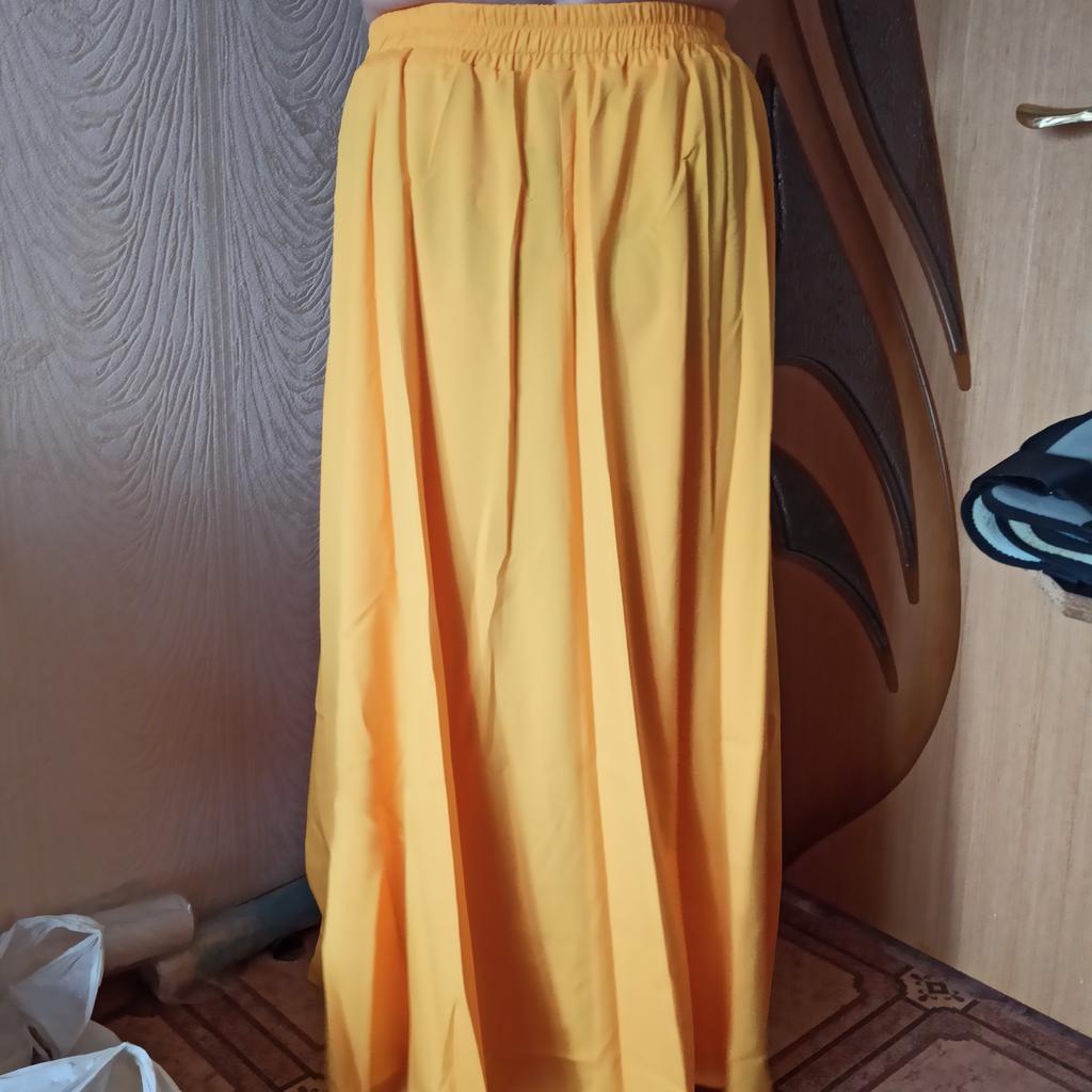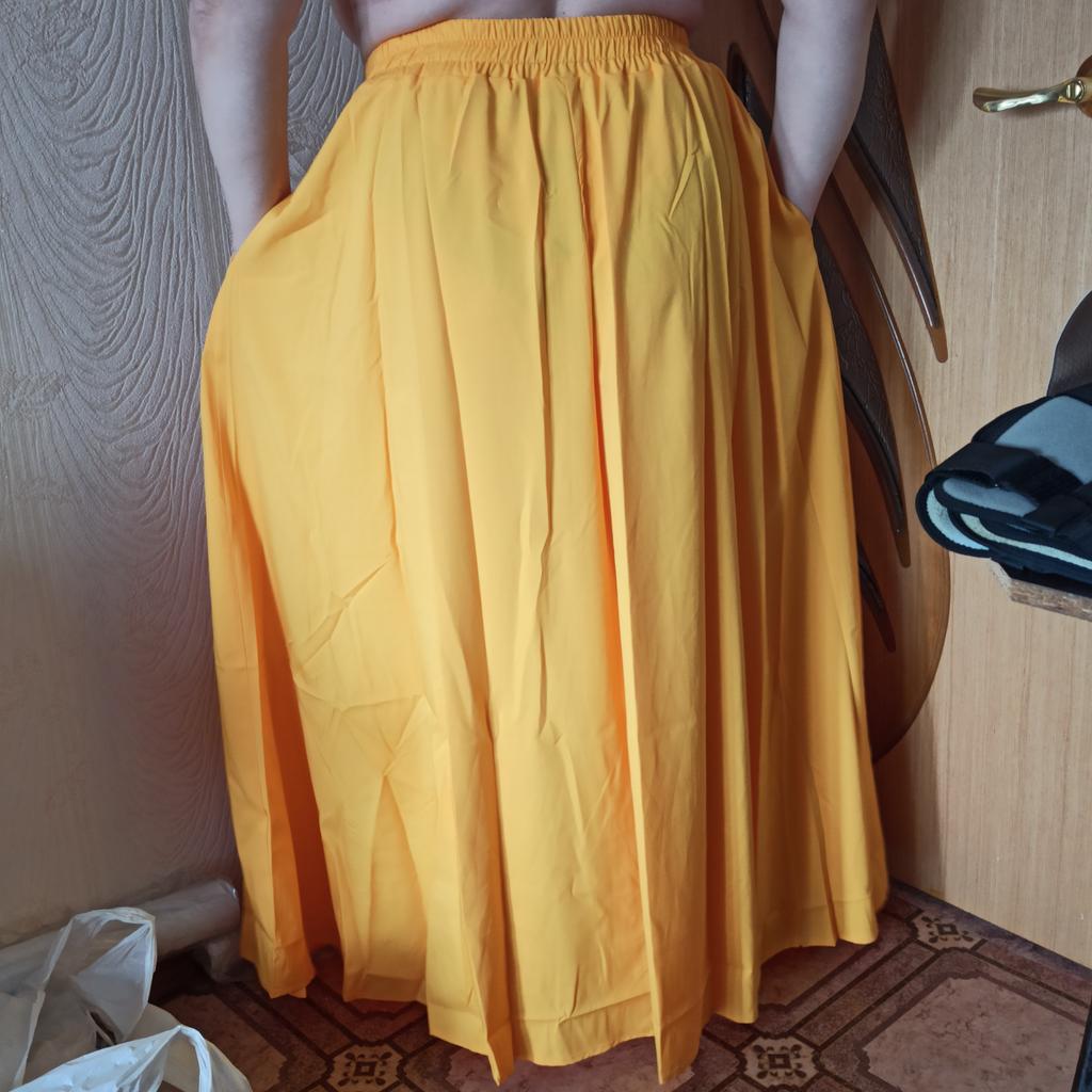 Хороший материал, яркий цвет, карманы, очень быстрая доставка. Немного большемерит в талии, хотя наполовину с резинкой. Заказывала на ОТ-100, ОБ-110. Не такая складчато-пышная как на фото. На фото можно подумать что модель"солнце", реально больше похоже что "колокол". Возможно на худеньких будет смотреться интереснее. Очень длинная. Мой рост 170, юбка легла на пол около 2 см. С небольшим каблучком будет красиво- в пол, а вот с балетками придётся подшить.