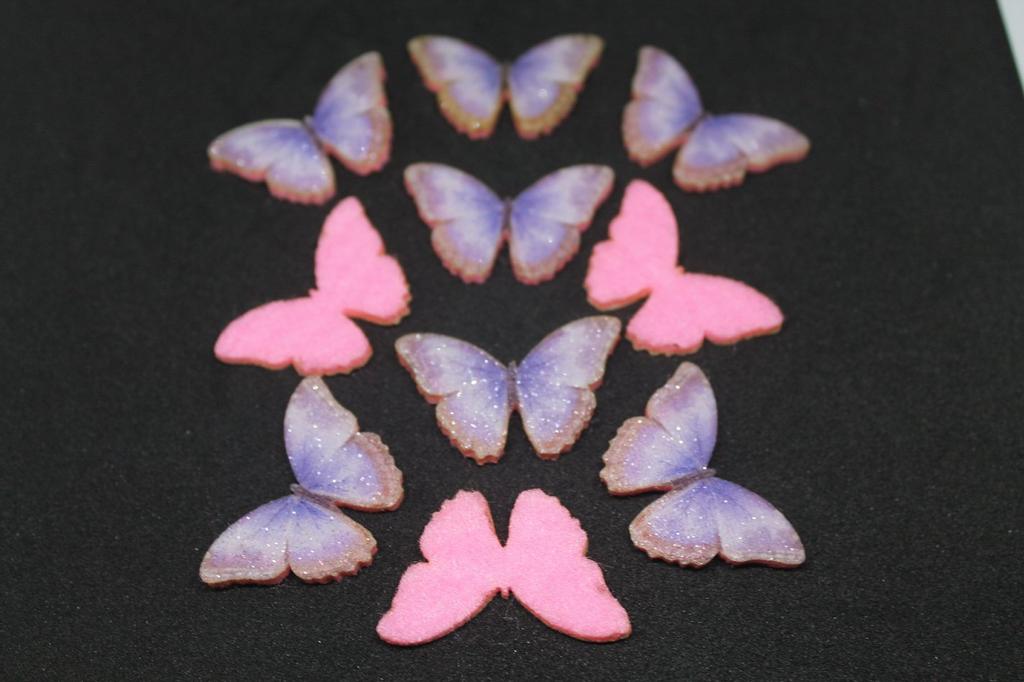 Тканевые бабочки. Товар соответствует описанию и фото продавца. Путь полностью отслеживался. Пришло уведомление от Джум и почты России. Товар представляет собой- лёгкую ткань с рисунком бабочки которая приклеина на плотный фетр.