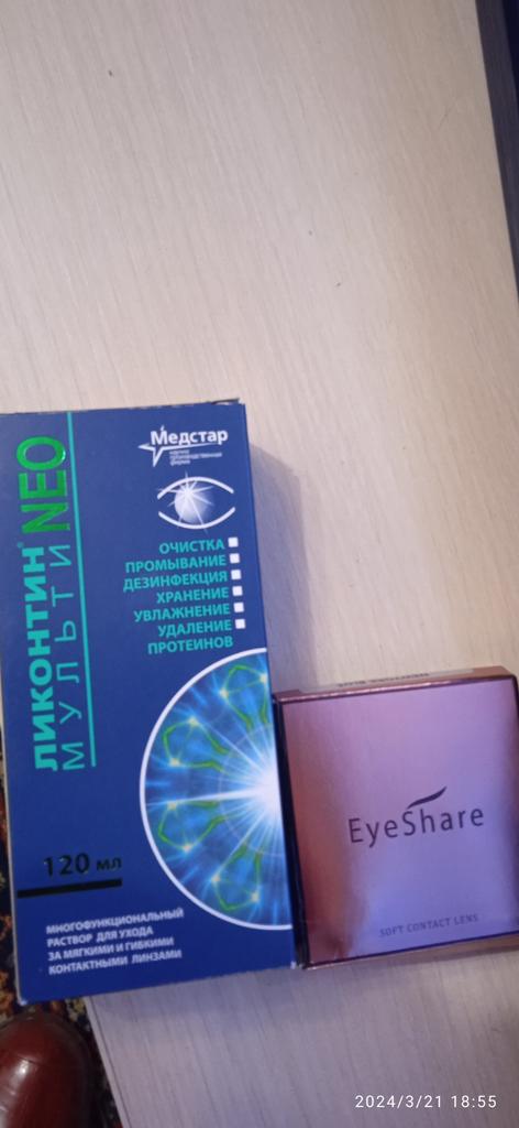 Ах.., не померила ещё... Купила раствор для ухода за линзами. Товар понравился. Видно линзы в растворе своём, голубые с прожилками. Входят в комплект и два контейнера для дальнейшего их хранения при использовании. Позже добавлю, понравились, удобны ли🙂 Добавляю, вчера одела( плохо получается, один глаз с четвёртой попытки, а другой, сорок минут..) Замечательно! Глазам комфортно, только вначале. Кто не знает, что у меня карие глаза - О..ОО, какие красивые глаза..! Кто знает, говорят, что, как у демона в Мастер и Маргарите))). 💓