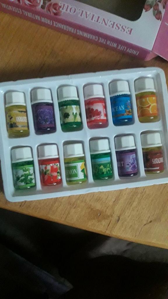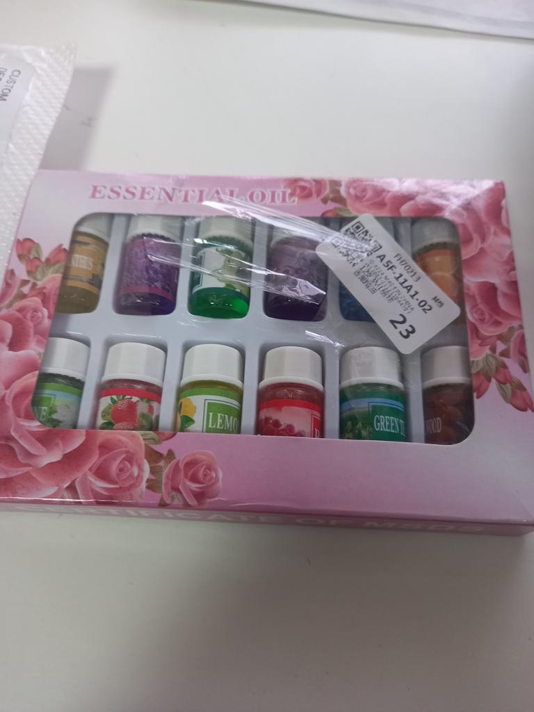 Аромамасло в маленьких баночках, по идее, должно растворяться в воде. Пока в деле не пробовала. Баночки совсем маленькие, см 5 где-то. Дозатора капель нет, просто пробка. Пахнет приятно. Упаковано было в пакет почты. Пленочка, что сверху на коробке была порвана, но сами баночки целы.