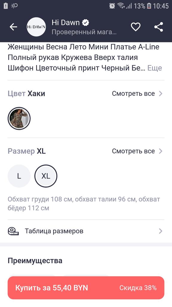 Заказала 24.12.2022, получила 18.01.2023. Размер ХЛ не соответствует заявленному ог 108 см, от 96 см, об 112 см, а пришёл размер ог 88 см, от 96 - 102 см, об 112 см. Мои параметры: ог 108см, от 98см, об 106см. Платье смотриться отвратительно из-за размера. Талия находится под грудью, пошив ужасный, плечо пришито одно плотно по телу, второе чуть по свобоней, но всё равно тянет на спину, пуговочка на груди постоянно растёгивается при ходьбе или поднятия немного руки, не говоря уже вверх, длина спинки 41см, такое причувствие, что верх платья пришили S, а низ ХЛ. Моя знакомая мерала это платье, у неё ог 88см на ней смотрися чуть лучше, талия села почти на место, но всё равно пару см не хватает. Талия моя находится там, где мои руки на животе. Обращалась в два отелье ни один не взялся переделать. К сожалению, я обратилась в службу поддержки очень поздно, т.к. отсутствовала дома очень долго, находилась в другом городе, не могла приехать домой и померить платье, деньги вернуть уже невозможно. Деньги за платья потерены, потому, что найти с такой фигурой, что бы ог был 85-88см, от 96-102см, об 112 см невозможно. Получилось у меня нет ни платья ни денег, зато продавец в шоколаде при деньгах за не качественный товар. Я хоть и получила этот товар, но не пользуюсь, т.к. ог мой 108 см, а по факту 85-88 см, поэтому не присалайте мне уведомления об изменении отзыва. Я бы хотела, что бы продавец мне всё же выслал мои деньги.