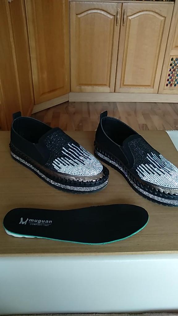 Смотрите видео. Самые желанные удобные туфли, лучше всяких кроссовок!!! Это мои третьи туфли. У этого продавца есть подробный мой обзор на эти туфли цвета хаки , у другого продавца на белые туфли. И вот я их так полюбила, что захотела и в черном цвете заказать. Немного огорчилась, что они из материала под замшу, а не из полиуретана, как мне показалось на промофото. Но испытываю их в комнате и понимаю, что обуви то у меня полно под кожу и кожаной, а как раз под замшу и не было...... Теперь есть!!! На сухую погоду милое дело, успели к сезону!!! Наконец -то на широкую стопу есть мягкая удобная обувь!!!!! На размер 24,5 берите 24,5. Я взяла 25, но поносила их дважды на большие расстояния, они расстянулись и немного хлябают. Если не продам подруге, она просила, то вставлю ещё одну стельку, если продам, то сразу же закажу свой размер. Стразы- блёстки намертво наклеены. Стелечка супер, не матерчатая, а значит долговечная, на высоком мягком подпяточнике. Основа хорошо амортизирует. Суперкомфортные !!! Пришли в сборной посылке, быстро. Упаковка и в пеноплен и в пупырку, пяточка не замята. Товар, а особенно продавца рекомендую, заботится о товаре. Заказ оформляла на пике роста цен, но не жалею. Теперь они снова не дорогие( с купоном и акцией часа)