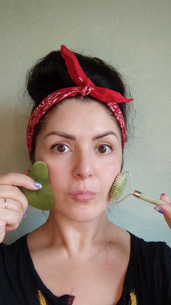 Скребок гуаша и роллер Роллер, конечно, баловство, а вот гуаша реально рабочий инструмент. А в связке это просто топ! Я склонна к отекам, да, собственно, после 35 они у каждой второй, даже если лицо худенькое. А уж если вы обладательница пышных щёчек, то сам Бог велел попробовать лимфодренажные техники. Я фанат домашнего ухода и процедур. Все мои визиты к косметологу вау эффекта не имели, а иногда только усугубляли ситуацию. И дело не в стоимости процедур, просто у меня атопичная кожа, она очень капризная и не любит излишнее химическое воздействие. А вот физическое - это дааа... Но в физическом воздействии важна регулярность. И лучше делать массажик по чуть чуть, но каждый день, чем полноценную процедуру, но раз в полгода. Да и жадность моя природная берёт своё)) Поэтому если что-то могу делать сама - делаю и радуюсь. Так вот, про гуаша. Техник в интернете много, можно подобрать то, что подойдёт именно вам. Мне понравился метод, поскольку он быстро прям рисует рельеф. И кожа становится более упругой. На видео я второй раз в жизни использую скребок. По гидрофильному маслу. Очень приятная процедура. И на видео можно заметить, как скула во время массажа становится чётче. Через месяц замеряю результат. Очень интересно, какая разница будет. Ну и про сам скребок. Сделан из нефрита, роллер тоже из него Аккуратно и безопасно упакован.
