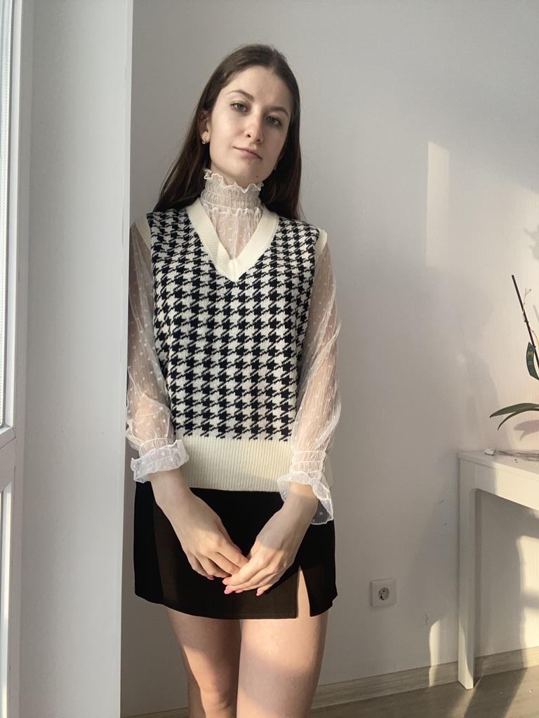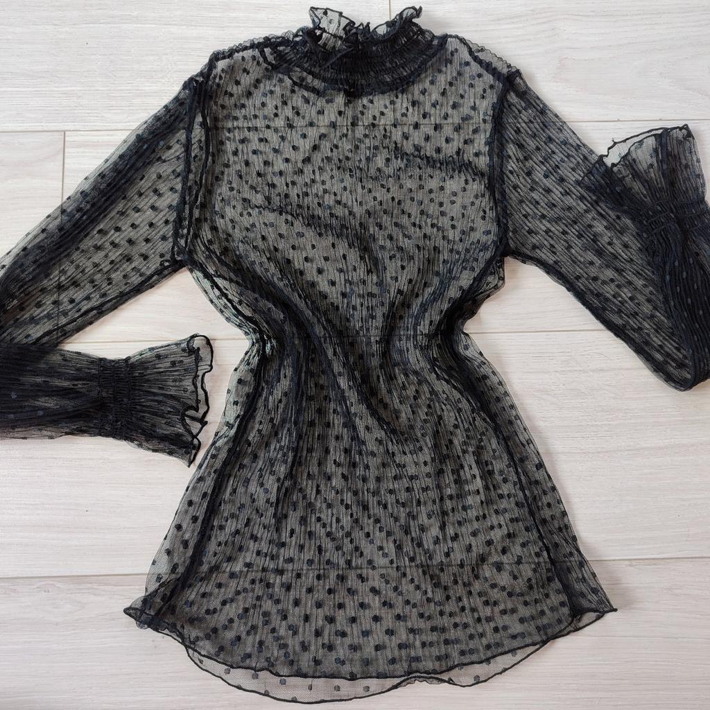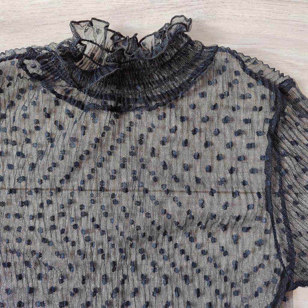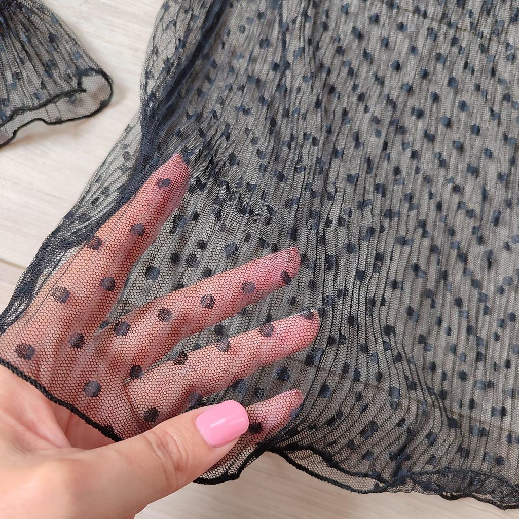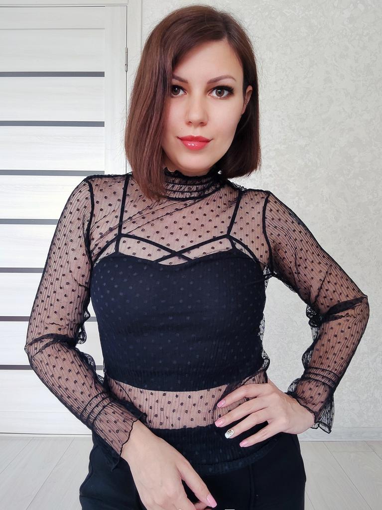 Нежная сеточка-блуза. Доставка заняла ровно месяц до отделения Укрпочты, соборная посылка Joom. В магазине на выбор есть 3 варианта расцветки, я заказала чёрную. Размер единый. На мои параметры ОГ 90 и ОТ 80 см, рост 172 см, блуза села хорошо, она тянется, но на меня уже впритык. Рекомендую на наш 42-44 (S-M), чтоб блуза сидела более свободно и комфортно. Длина рукава нормальная, но хотелось бы ещё пару сантиметров добавить. Модель очень красивая сделана под водолазку, на горловине и рукавах резиночки. Лёгкая прозрачная ткань-сеточка в мелкий горошек. Носить можно на топы, майки и закрытые бюстгальтеры, а можно одевать под жилетку, свитер или рубашку. В общем, вариантов носки очень много, эта блуза станет отличным дополнением гардероба и поможет стилизовать образ. Я довольна приобретением, к покупке могу рекомендовать!