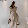 Осень-зима Элегантное женское длинное трикотажное платье с круглым вырезом, облегающее платье с длинными рукавами и оборками, плиссированное платье с поясом, женское платье-свитер