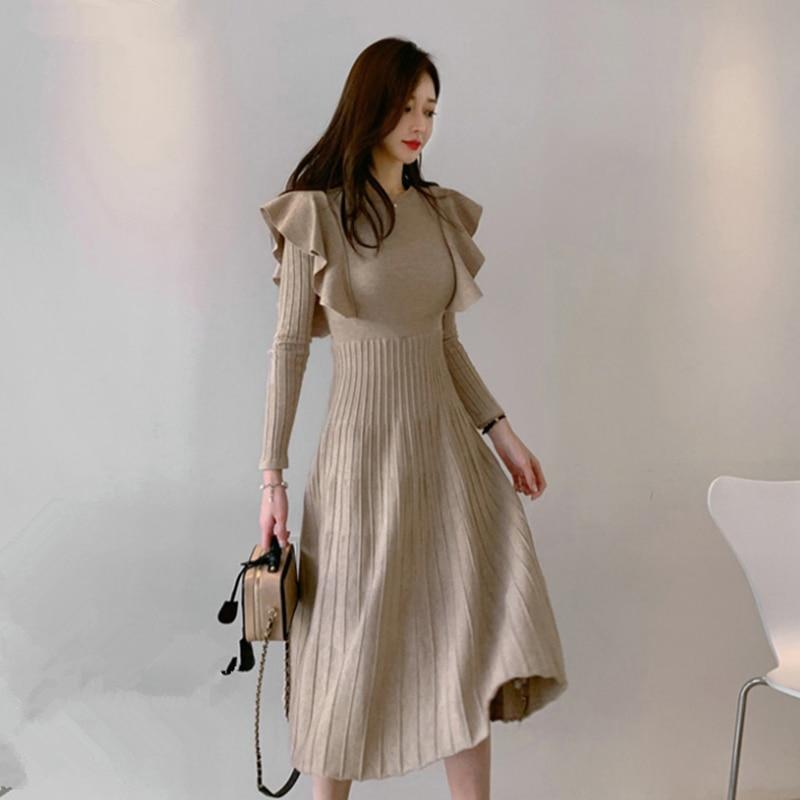 Осень-зима Элегантное женское длинное трикотажное платье с круглым вырезом, облегающее платье с длинными рукавами и оборками, плиссированное платье с поясом, женское платье-свитер — купить товар онлайн с бесплатной доставкой по всему миру!