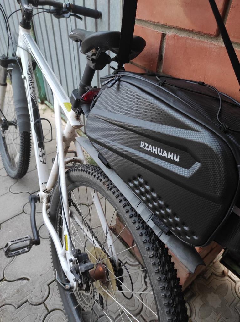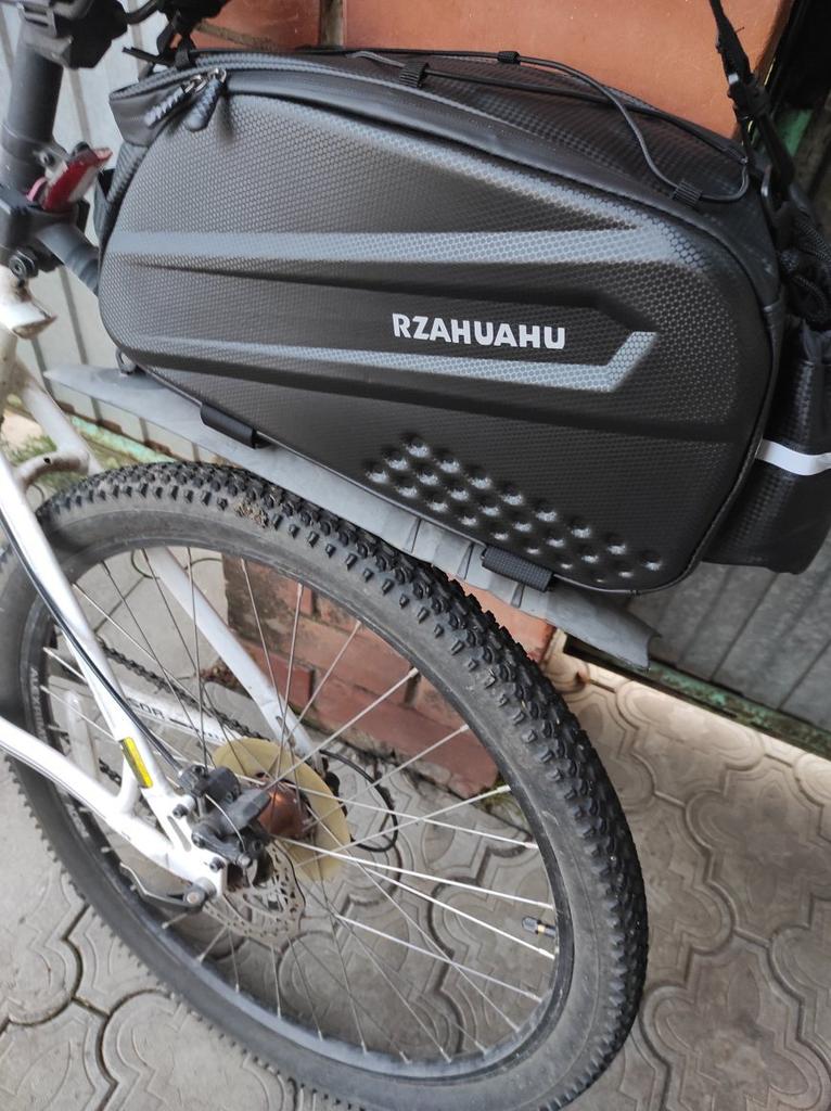 Очень подходящая для велика сумка! Боковины жесткие так что сумка не ,,РАсползается " так сказать по багажнику четко крепится лямками липучками,карман для бутылочки просто супер! 1л в точку, да и затяжечка есть. В комплекте чехол не промокайка ярко желттый ,ремень для ношения на плече. Для понимания размера 5 литровая пластиковая емкость для воды ложится четко в сумку .при этом сверху остается еще место. Отличная сумка! Всем рекомендую .товар качественный!