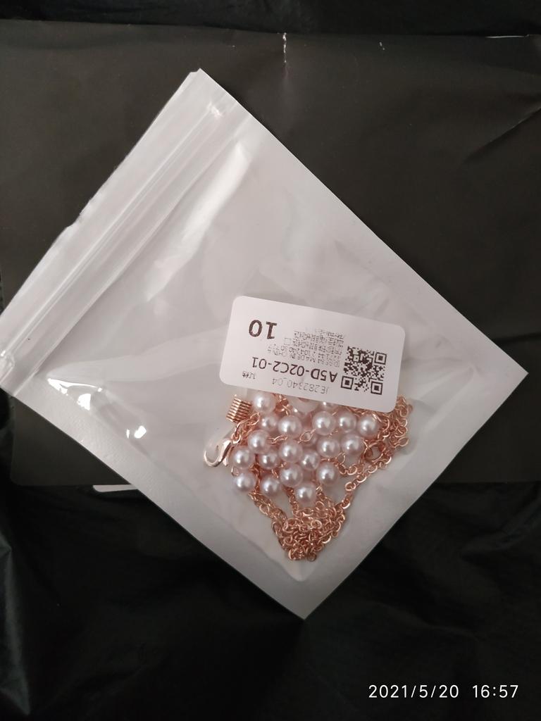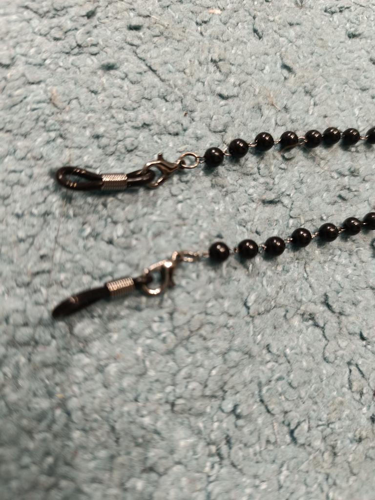У моих очков черная оправа. Цепочка - практичная. От дужек можно отстегнуть (замочки ,как на цепочках на шею). Бусинки аккуратные. Сама цепочка черная, не потемнеет))) И надеюсь, что не протрется. Ну, посмотрим.