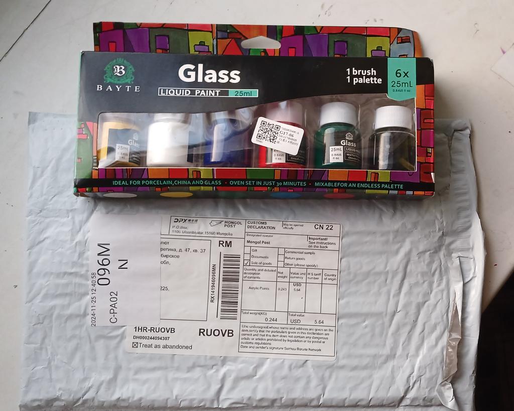 За 3 недели доставили. Упаковка слегка помятая. Содержимое целое. Попробуем в деле, отпишусь. Спасибо продавцу и Joom! Краска акриловая, а не витражная, после обжига не становится прозрачной как цветное стекло.