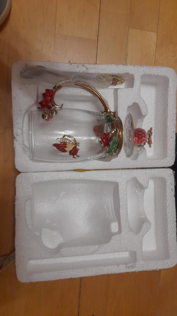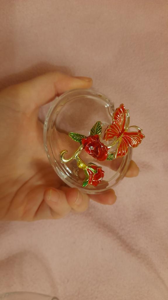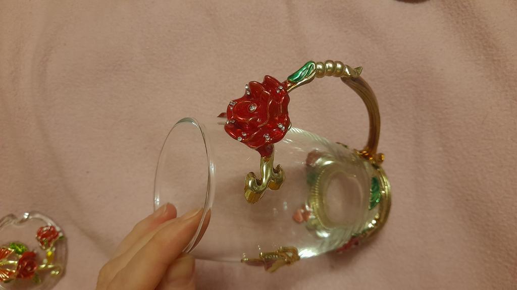 📲 Заказ оформлен 27.11.2023 прибыл 09.01.2024 г.Москва, в фирменном почтовом пакете Joom, объеденённая посылка. 📦 Упакован в противоударну коробку из пенопласта, и в пакет. Материал: стекло + легкий пластик (точно не метал) с краской и стразами. Ложка - металл + пластик. Колличество: кружка + крышка + ложка. 💳 Покупала по скидке за 1'043 руб. Внешне - очень довольна, в мою коллекцию роз 🌹 Продавца рекомендую 😁🤝