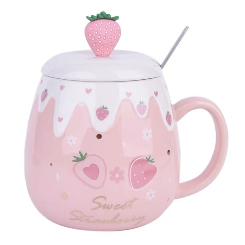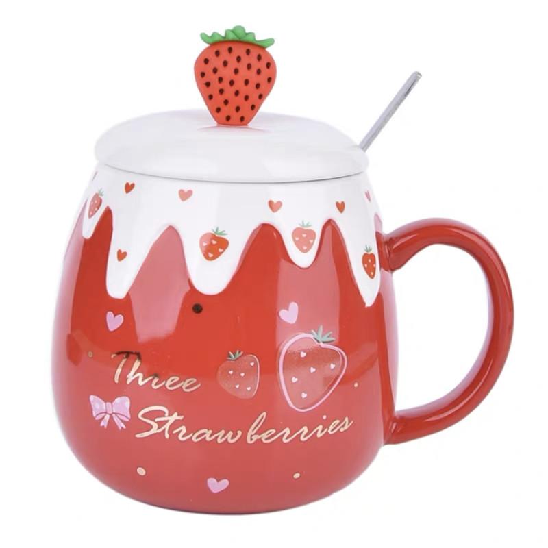 Керамическая милая кружка для кофе с клубникой и крышкой и ложкой, креативная фарфоровая чашка для завтрака, молока, овсянки, посуда для напитков